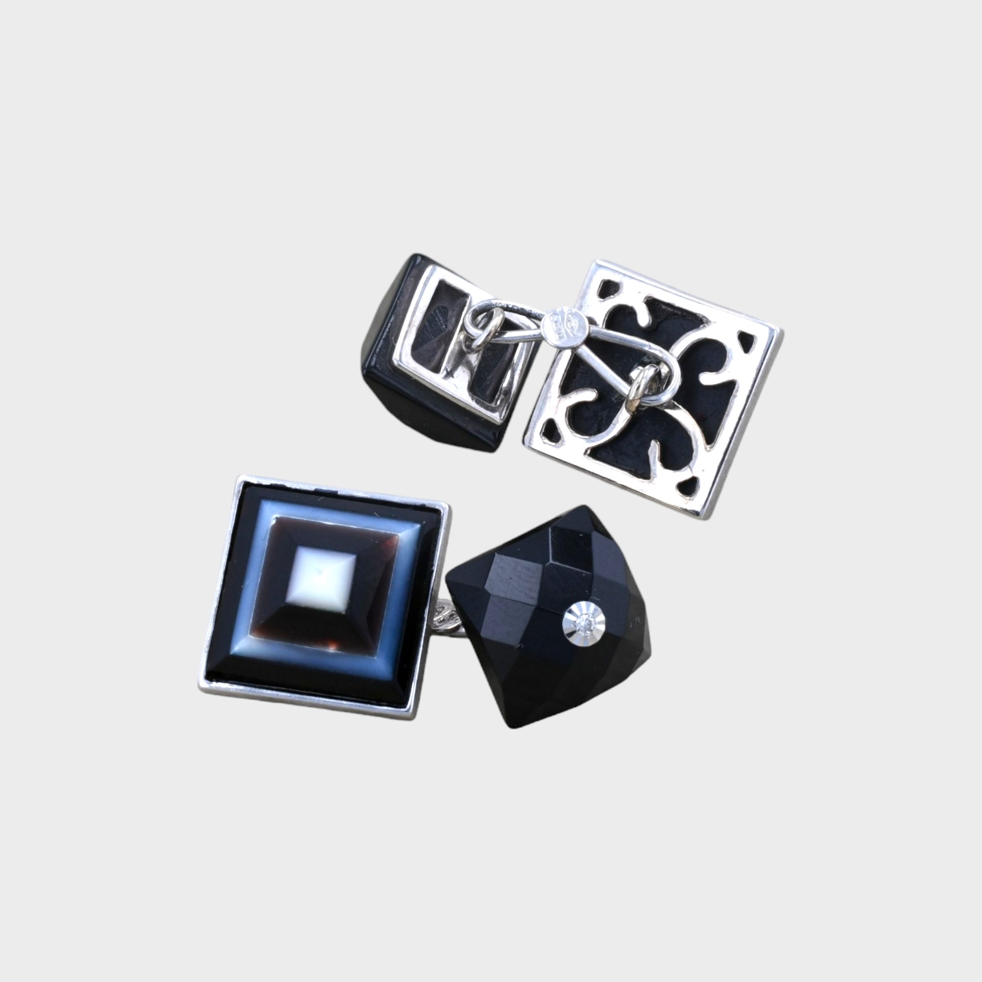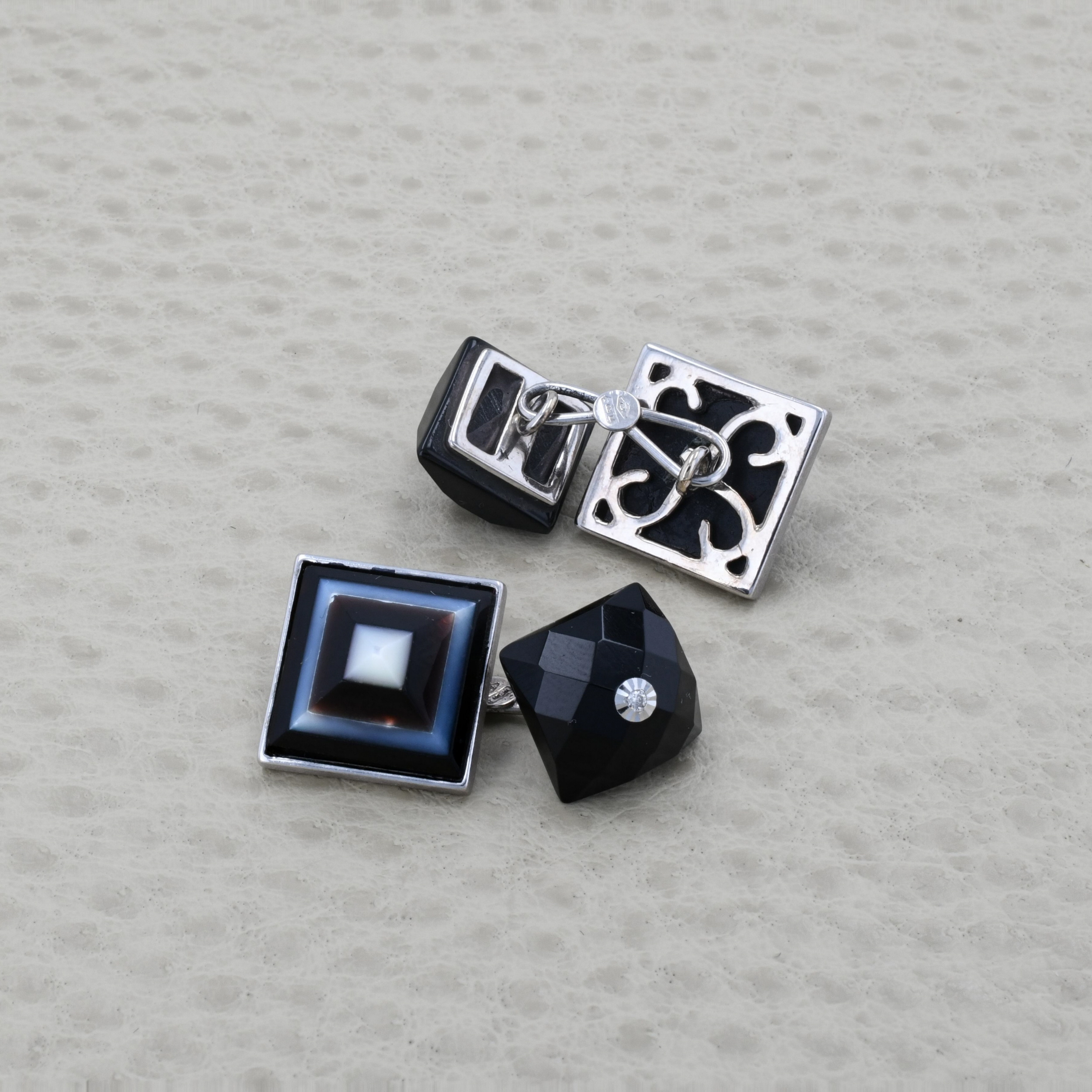 Butoni din aur alb 18k, onix alb si negru, 9,25 grame, diamante ~ 0,012 ct.(2 bucati), claritate VS, taietura briliant, dimensiune patrat mic ~ 1 x 1 cm, dimensiune patrat mare ~ 1,3 x 1,3 cm.