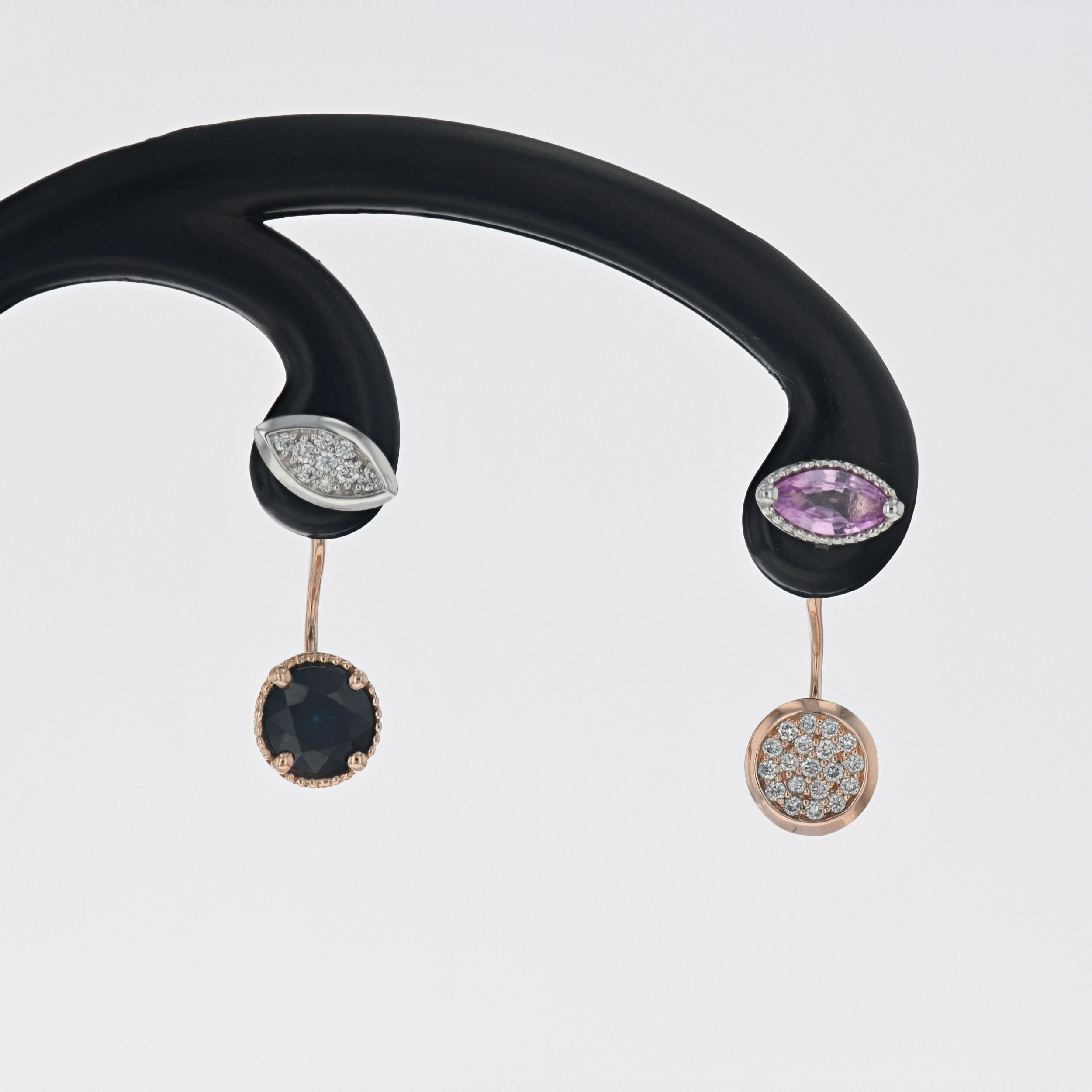 Cercei 3,22 grame aur roz si alb 18k, safir roz ~ 0,34 ct., taietura marquise, safir albastru ~ 0,84 ct.,taietura rotunda, diamante ~ 0,17 ct., taietura rotunda briliant, culoare F – G, claritate VS, dimensiune ~ 2,00 x 0,8 cm.