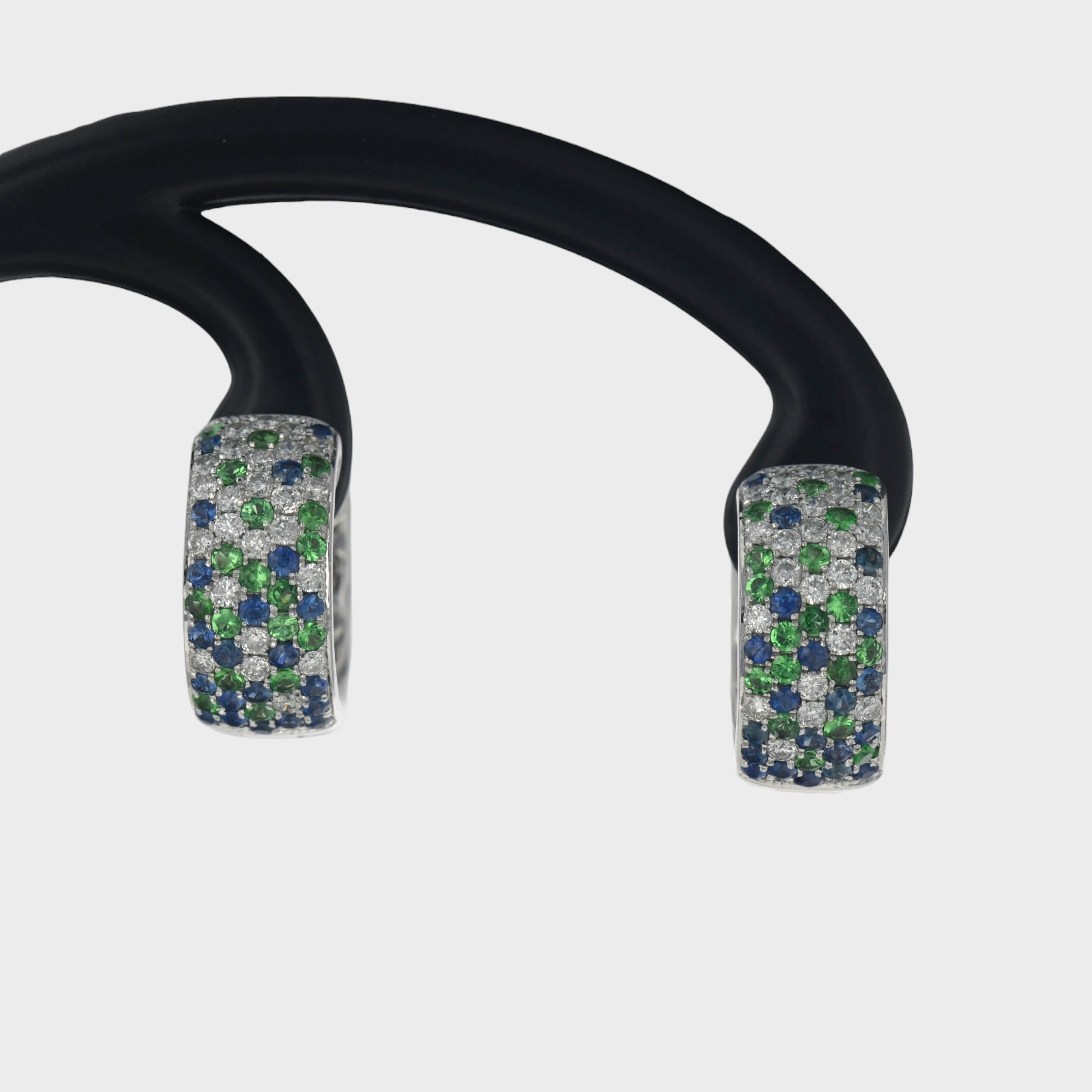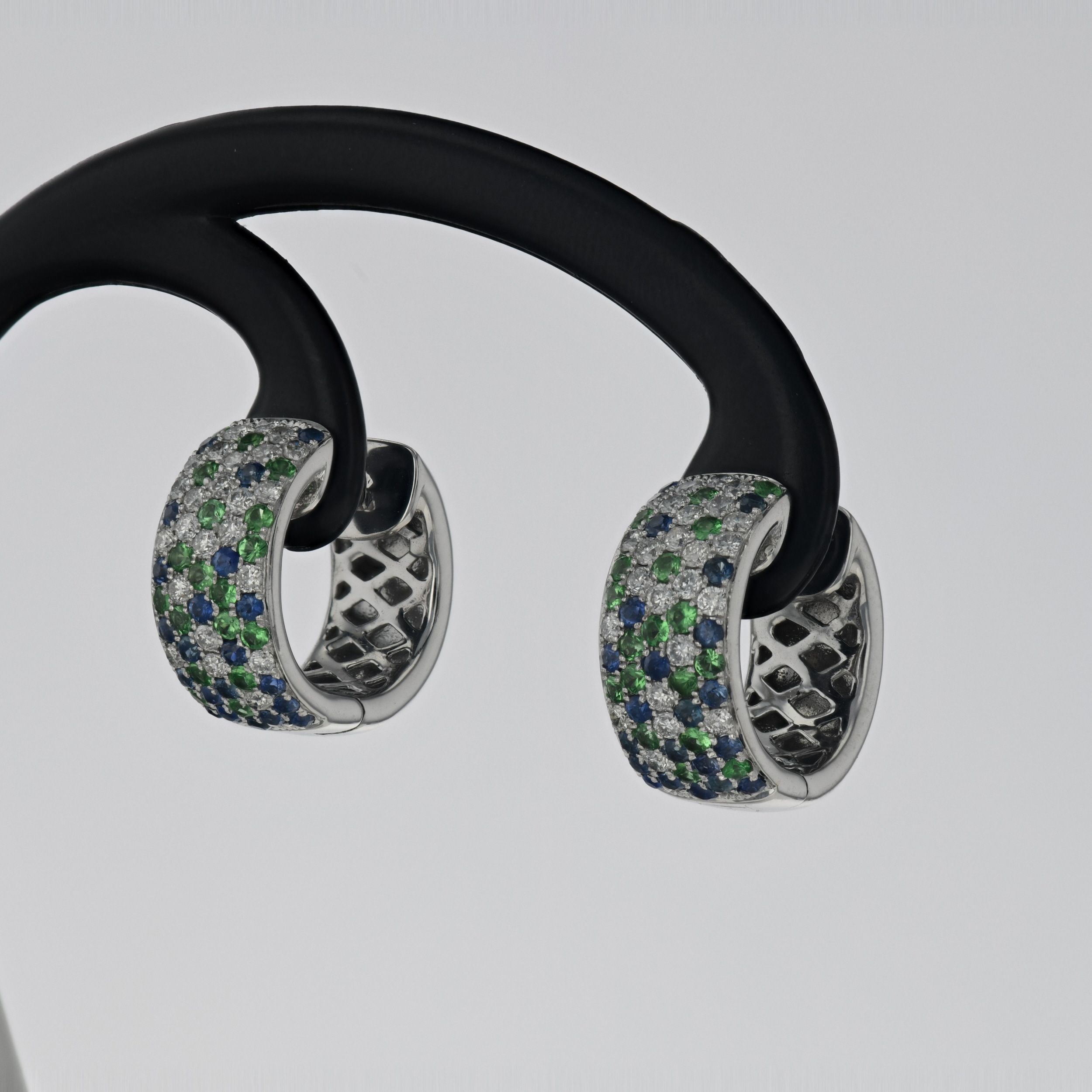 Cercei aur alb 18k, 9,60 grame, diamante ~ 0,67 ct., taietura briliant, culoare H – I, claritate VS, safire ~ 0,68 ct., taietura briliant, culoare albastru, granate ~ 0,60 ct., taietura briliant, culoare verde, latime ~ 0,7 cm.