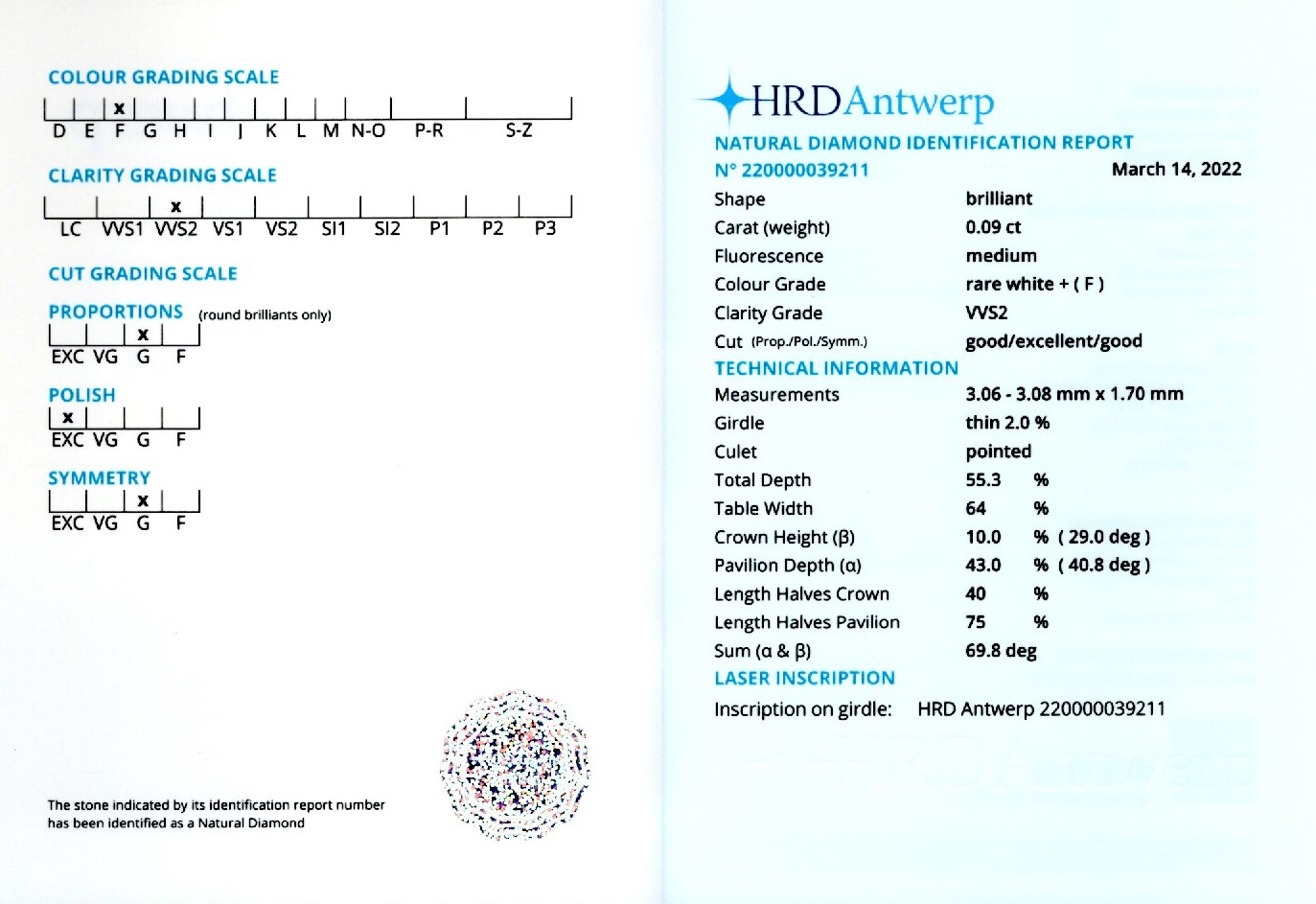 Diamant 0,09 ct., culoare F(rare white +), claritate VVS2, forma briliant, taietura G, fluorescenta medie, dimensiune 3,06 – 3,08 x 1,70 mm, certificare HRD Antwerp 220000039211.