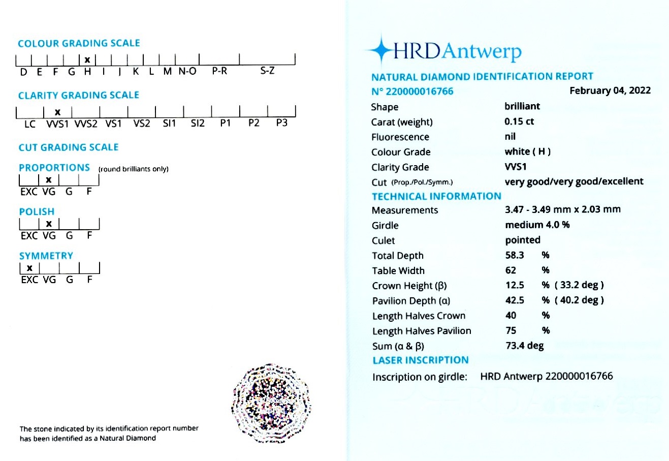 Diamant 0,15 ct., culoare H(white), claritate VVS1, forma briliant, taietura VG, fluorescenta absenta, dimensiune 3,47 – 3,49 x 2,03 mm, certificare HRD Antwerp 220000016766.