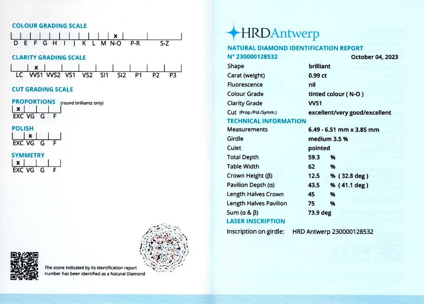 Diamant natural 0,99 ct., culoare N – O( very light yellow – conform gradarii GIA), claritate VVS1, forma rotunda briliant, taietura EXC, fluorescenta absenta, certificare HRD Antwerp 230000128532, dimensiune 6,49 – 6,51 x 3,85 mm.