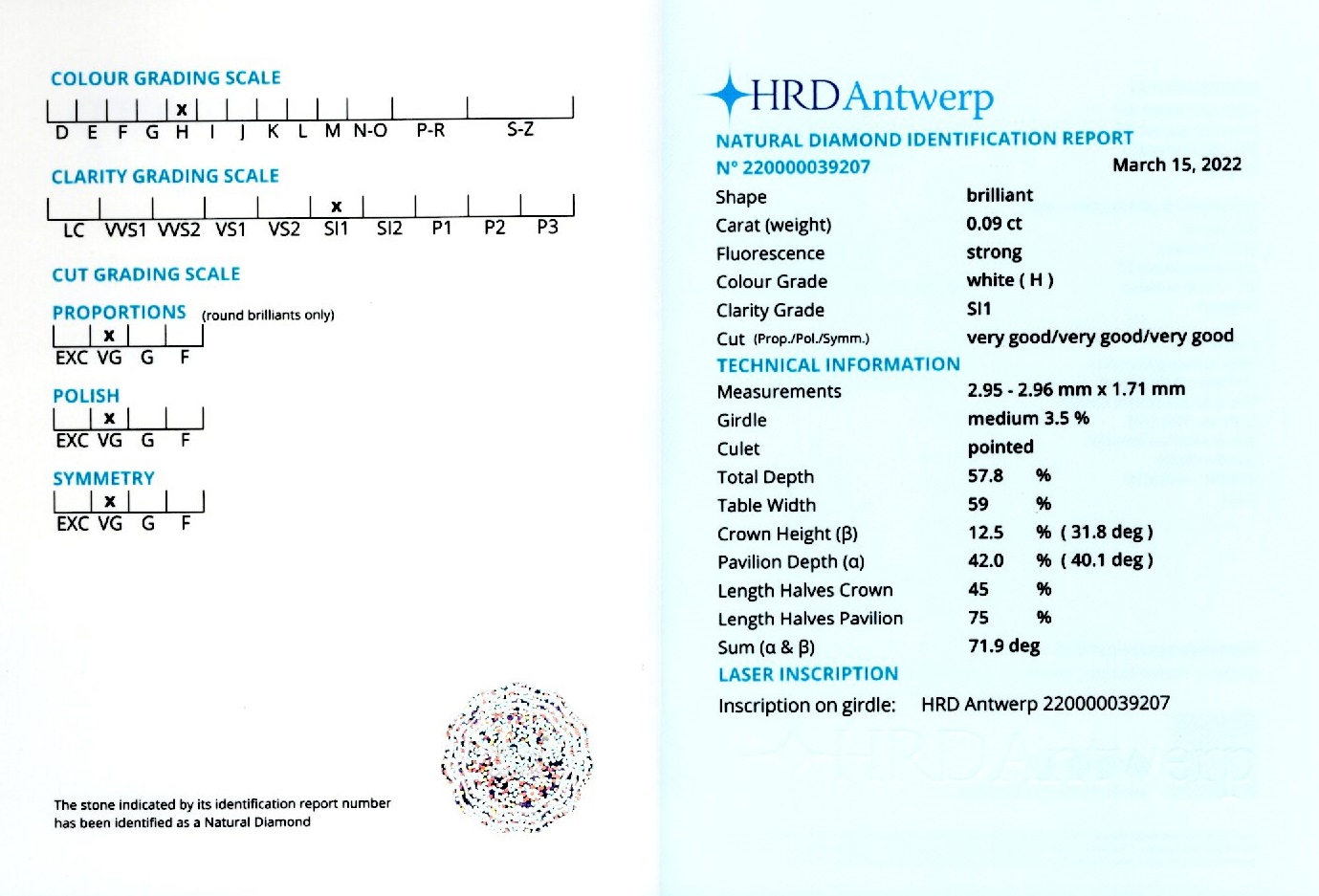 Diamant natural 0,09 ct., culoare H(white), claritate SI1, forma briliant, taietura VG, fluorescenta puternica, dimensiune 2,95 – 2,96 x 1,71 mm, certificare HRD Antwerp 220000039207.