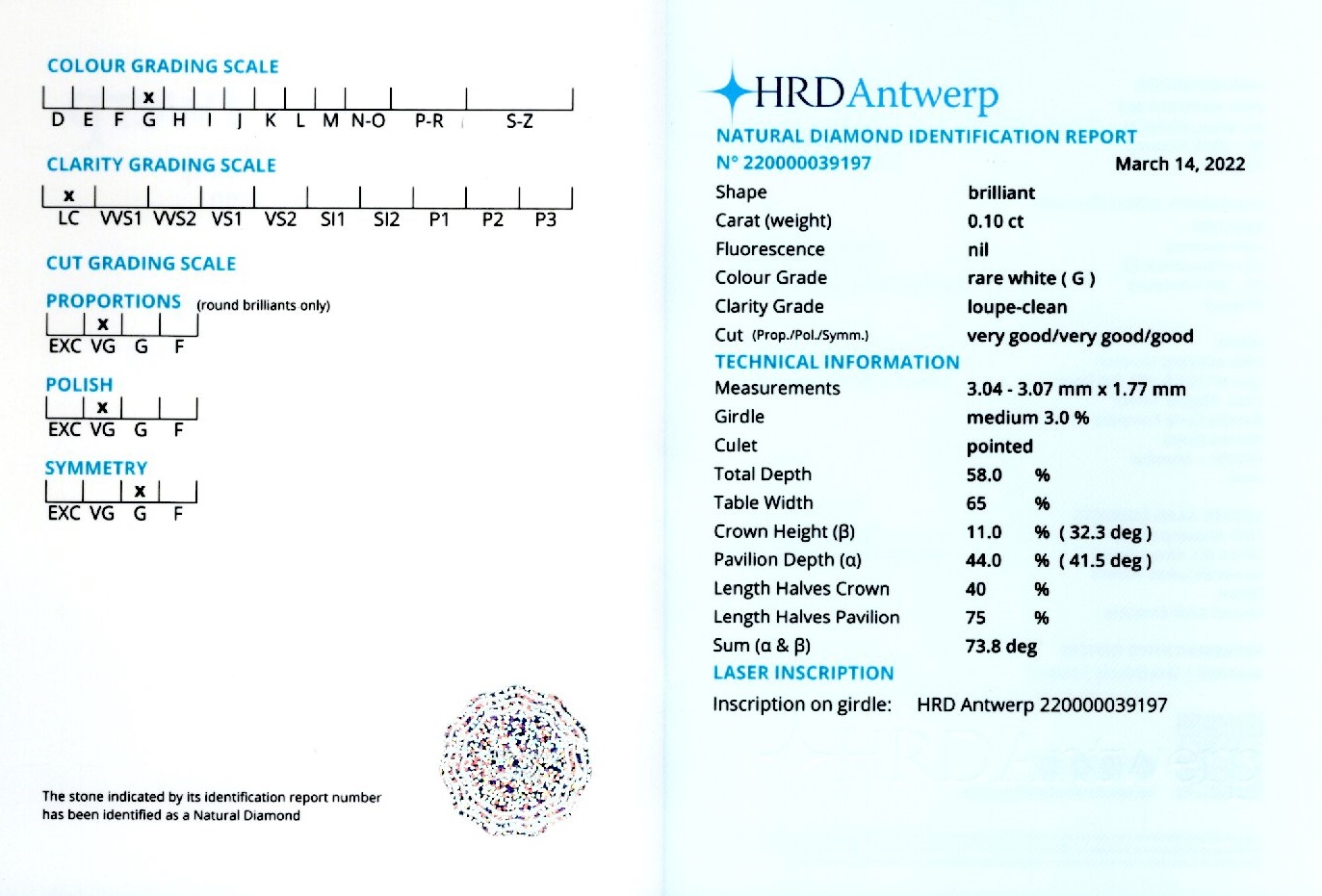 Diamant natural 0,10 ct., culoare G(rare white), claritate loupe-clean, forma briliant, taietura VG, fluorescenta absenta, dimensiune 3,04 – 3,07 x 1,77 mm, certificare HRD Antwerp 220000039197.