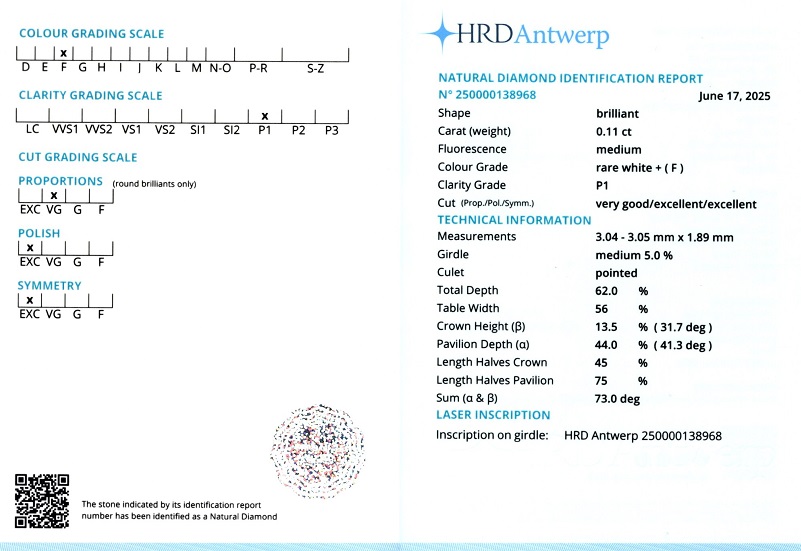 Diamant natural 0,11 carate, culoare F(rare white +), claritate P1, forma rotunda briliant, taietura VG, fluorescenta medie, dimensiune 3,04 – 3,05 x 1,89 mm, certificare HRD Antwerp 250000138968.
