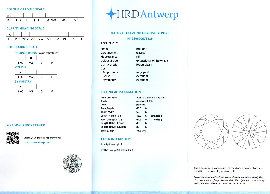 Diamant natural 0,12 carate, culoare D(exceptional white +), claritate LC, forma rotunda briliant, taietura VG, fluorescenta absenta, dimensiune 3,21 – 3,22 x 1,95 mm, certificare HRD Antwerp 250000073829.