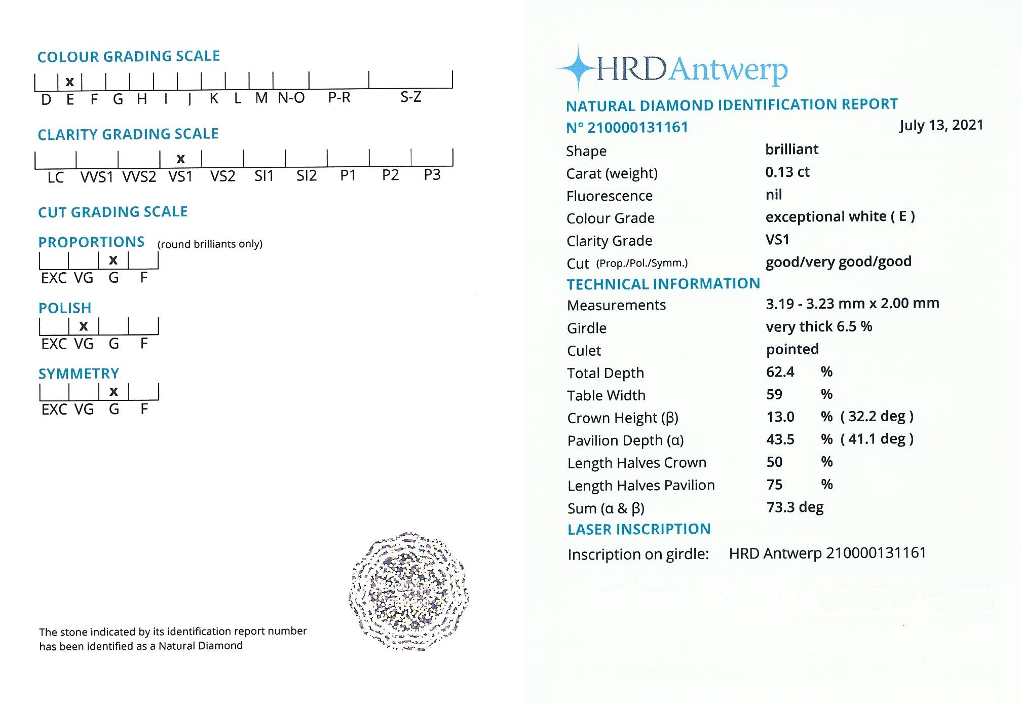 Diamant natural  0,13 carate, culoare E, claritate VS1, forma rotunda briliant, fluorescenta absenta, dimensiune 3,19 – 3,23 x 2,00 mm, certificare HRD Antwerp nr. 210000131161.