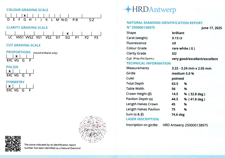 Diamant natural 0,13 carate, culoare G(rare white), claritate SI2, forma rotunda briliant, taietura VG, fluorescenta absenta, dimensiune 3,22 – 3,24 x 2,05 mm, certificare HRD Antwerp 250000138975.