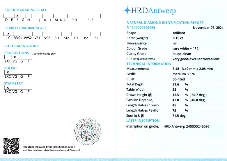 Diamant natural 0,15 carate, culoare F (rare white+), claritate LC, forma briliant, taietura VG, fluorescenta absenta, dimensiune 3,48 – 3,49 x 2,08 mm, certificare HRD Antwerp 240000246096.