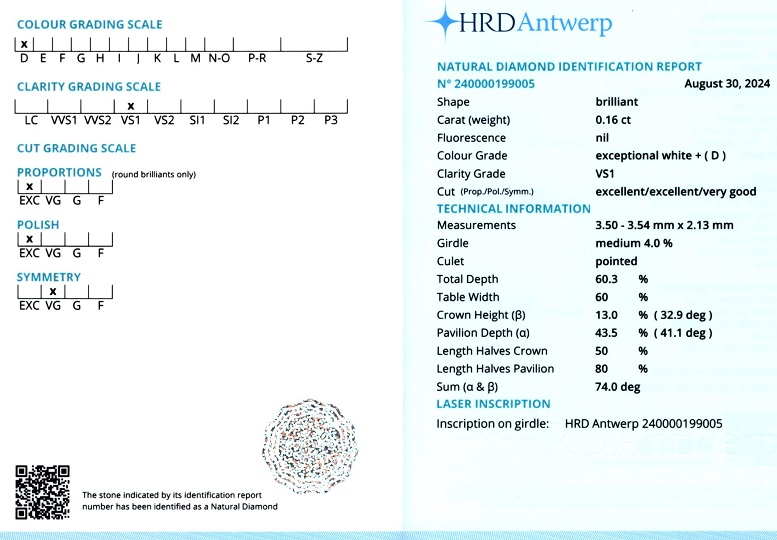 Diamant natural 0,16 carate, culoare D (exceptional white+), claritate VS1, forma briliant, taietura EXC, fluorescenta absenta, dimensiune 3,50 – 3,54 x 2,13 mm, certificare HRD Antwerp 240000199005.