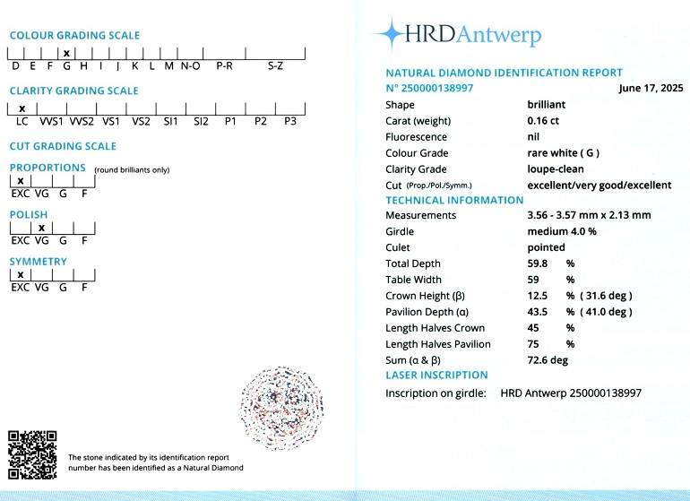 Diamant natural 0,16 carate, culoare G(rare white), claritate LC, forma rotunda briliant, taietura EXC, fluorescenta absenta, dimensiune 3,56 – 3,57 x 2,13 mm, certificare HRD Antwerp 250000138997.