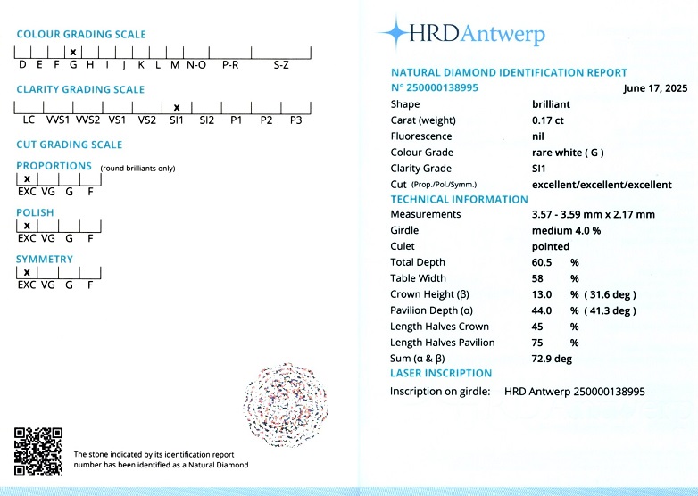 Diamant natural 0,17 carate, culoare G(rare white), claritate SI1, forma rotunda briliant, taietura EXC, fluorescenta absenta, dimensiune 3,57 – 3,59 x 2,17 mm, certificare HRD Antwerp 250000138995.