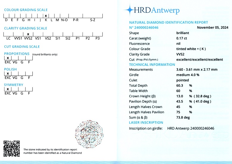 Diamant natural 0,17 carate, culoare K, claritate VVS2, forma briliant, taietura EXC, fluorescenta absenta, dimensiune 3,60 – 3,61 x 2,17 mm, certificare HRD Antwerp 240000246046.