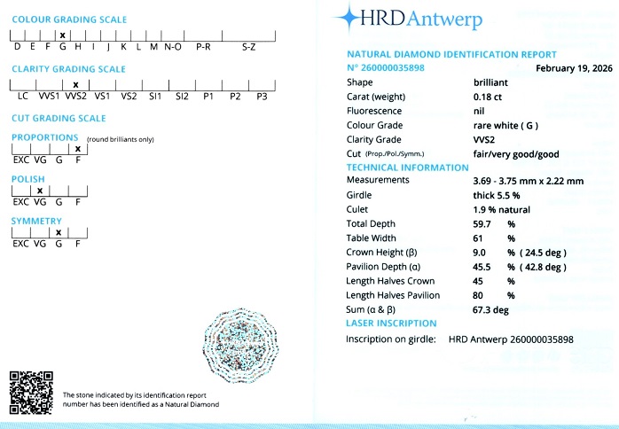Diamant natural 0,18 carate, culoare G(rare white), claritate VVS2, forma rotunda briliant, taietura Fair, fluorescenta absenta, dimensiune 3,69 – 3,75 x 2,22 mm, certificare HRD Antwerp 260000035898.