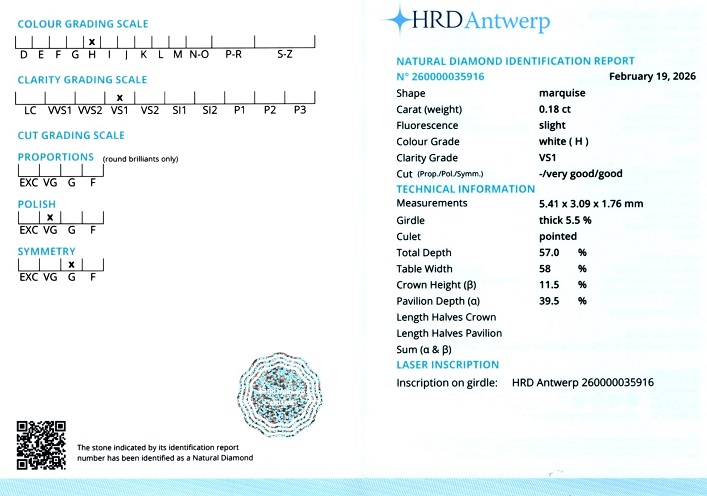 Diamant natural 0,18 carate, culoare H, claritate VS1, forma marquise, fluorescenta usoara, dimensiune 5,41 x 3,09 x 1,76 mm, certificare HRD Antwerp Ref. nr. 260000035916.