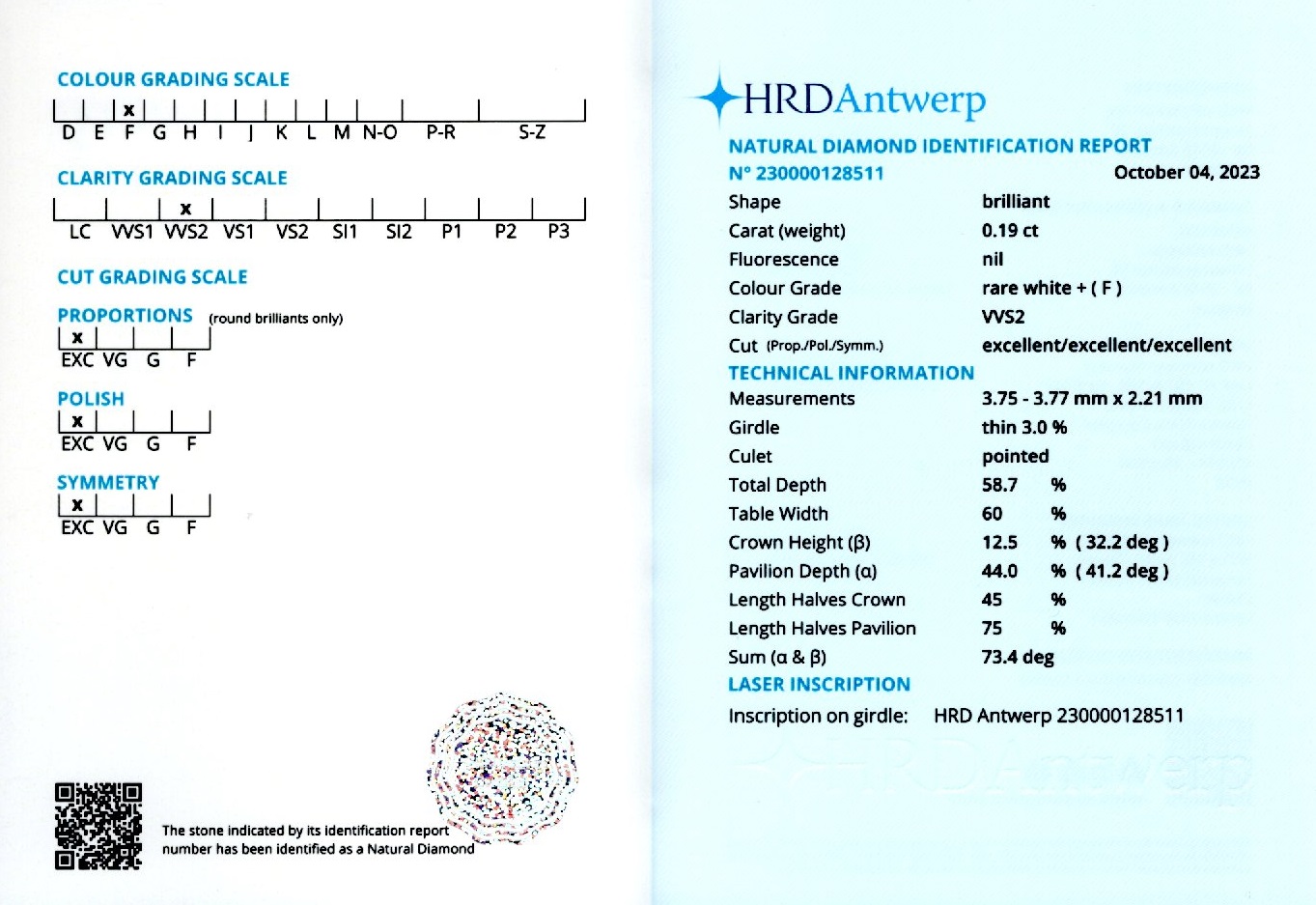 Diamant natural 0,19 ct., culoare F(rare white +), claritate VVS2, forma rotunda briliant, taietura EXC, fluorescenta absenta, dimensiune 3,75 – 3,77 x 2,21 mm, certificare HRD Antwerp 230000128511.