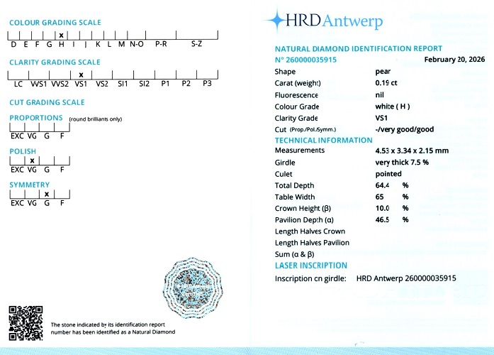 Diamant natural 0,19 carate, culoare H, claritate VS1, forma pear, fluorescenta absenta, dimensiune 4,53 x 3,34 x 2,15 mm, certificare HRD Antwerp 260000035915.
