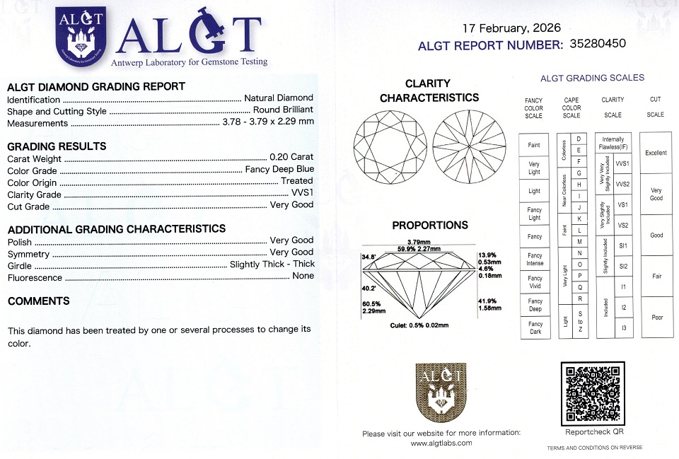 Diamant natural 0,20 ct., culoare Fancy Deep Blue, claritate VVS1, forma rotunda briliant, fluorescenta absenta, taietura VG, dimensiune 3,78 – 3,79 x 2,29 mm, certificare ALGT Antwerp 35280450.