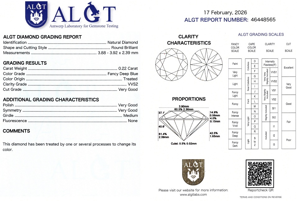 Diamant natural 0,22 ct., culoare Fancy Deep Blue, claritate VVS2, forma rotunda briliant, fluorescenta absenta, taietura VG, dimensiune 3,88 – 3,92 x 2,39 mm, certificare ALGT Antwerp 46448565.