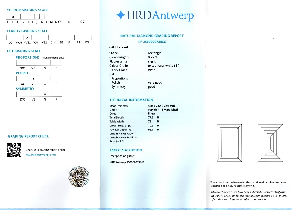 Diamant natural 0,25 carate, culoare E(exceptional white), claritate VVS2, forma dreptunghiulara, fluorescenta usoara, dimensiune 4,85 x 2,64 x 2,04 mm, certificare HRD Antwerp 250000073866.