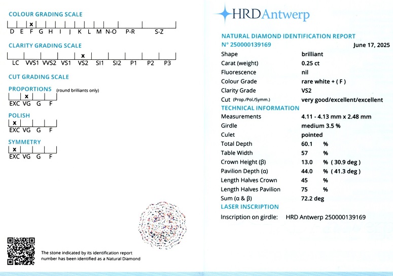 Diamant natural 0,25 carate, culoare F(rare white +), claritate VS2, forma rotunda briliant, taietura VG, fluorescenta absenta, dimensiune 4,11 – 4,13 x 2,48 mm, certificare HRD Antwerp 250000139169.