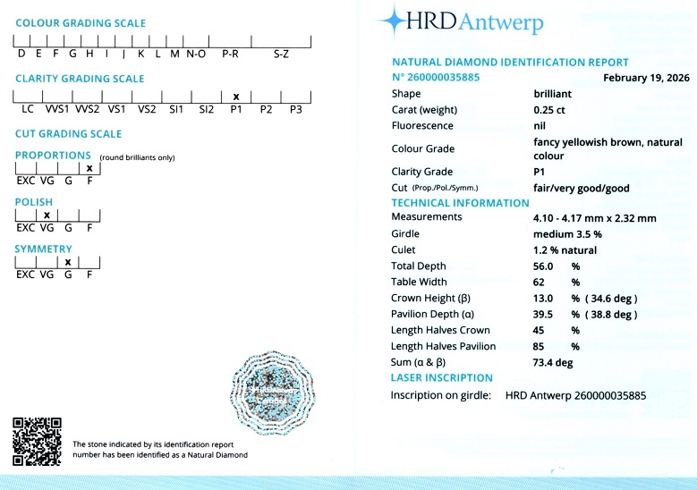 Diamant natural 0,25 carate, culoare Fancy yellowish brown(natural colour), claritate P1, foma rotunda briliant, taietura Fair, fluorescenta absenta, dimensiune 4,10 – 4,17 x 2,32 mm, certificare HRD Antwerp 260000035885.