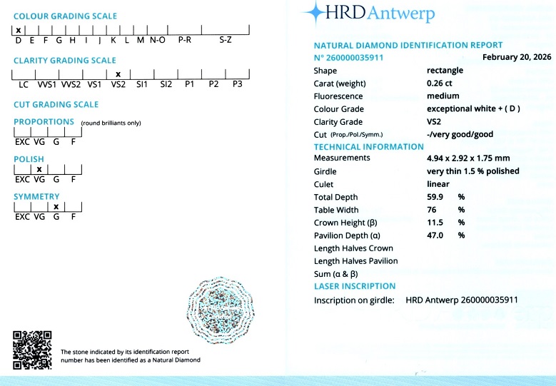 Diamant natural 0,26 ct., culoare D(exceptional white+), claritate VS2, forma dreptunghiulara, fluorescenta medie, dimensiune 4,94 x 2,92 x 1,75 mm, certificare HRD Antwerp 260000035911.