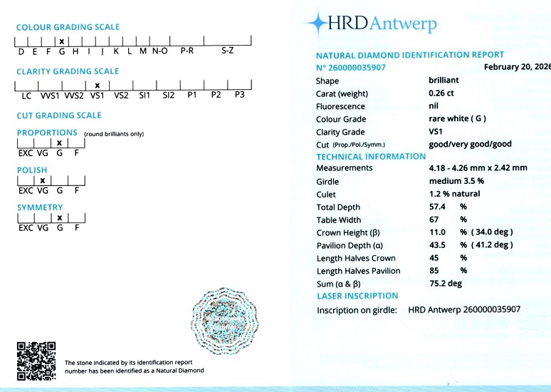 Diamant natural 0,26 carate, culoare G(rare white), claritate VS1, forma rotunda briliant, taietura G, fluorescenta absenta, dimensiune 4,18 – 4,26 x 2,42 mm, certificare HRD Antwerp 260000035907.