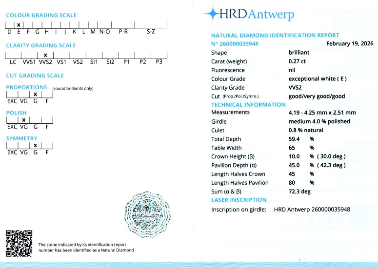 Diamant natural 0,27 carate, culoare E(exceptional white), claritate VVS2, forma rotunda briliant, taietura G, fluorescenta absenta, dimensiune 4,19 – 4,25 x 2,51 mm, certificare HRD Antwerp 260000035948.