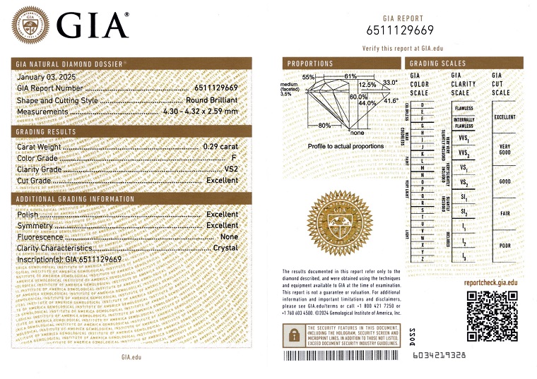 Diamant natural 0,29 carate, culoare F, claritate VS2, forma briliant, taietura EXC, fluorescenta absenta, dimensiune 4,30 – 4,32 x 2,59 mm, certificare GIA 6511129669.