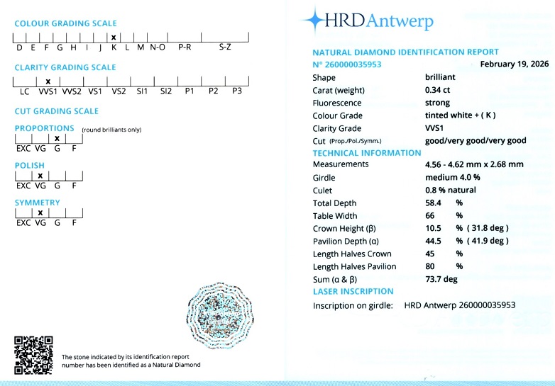 Diamant natural 0,34 carate, culoare K, claritate VVS1, forma rotunda briliant, taietura G, fluorescenta puternica, dimensiune 4,56 – 4,62 x 2,68 mm, certificare HRD Antwerp 260000035953.