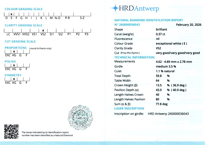 Diamant natural 0,37 carate, culoare E(exceptional white), claritate VS2, forma rotunda briliant, taietura VG, fluorescenta absenta, dimensiune 4,62 – 4,69 x 2,78 mm, certificare HRD Antwerp 260000036043.