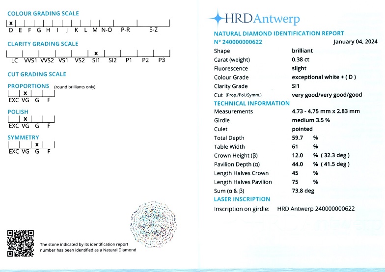 Diamant natural 0,38 ct., culoare D(exceptional white +), claritate SI1, forma briliant, taietura VG, fluorescenta usoara, dimensiune 4,73 – 4,75 x 2,83 mm, certificare HRD Antwerp 240000000622.