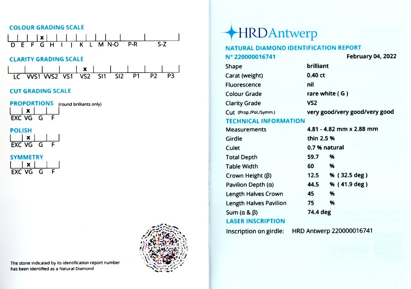 Diamant natural 0,40 ct., culoare G(rare white), claritate VS2, forma briliant, taietura VG, fluorescenta absenta, dimensiune 4,81 – 4,82 x 2,88 mm, certificare HRD Antwerp 220000016741.