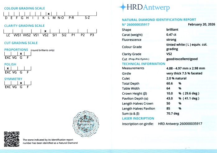 Diamant natural 0,47 carate, culoare L, claritate VS2, forma rotunda briliant, taietura G, fluorescenta puternica, dimensiune 4,88 – 4,97 x 2,98 mm, certificare HRD Antwerp 260000035917.
