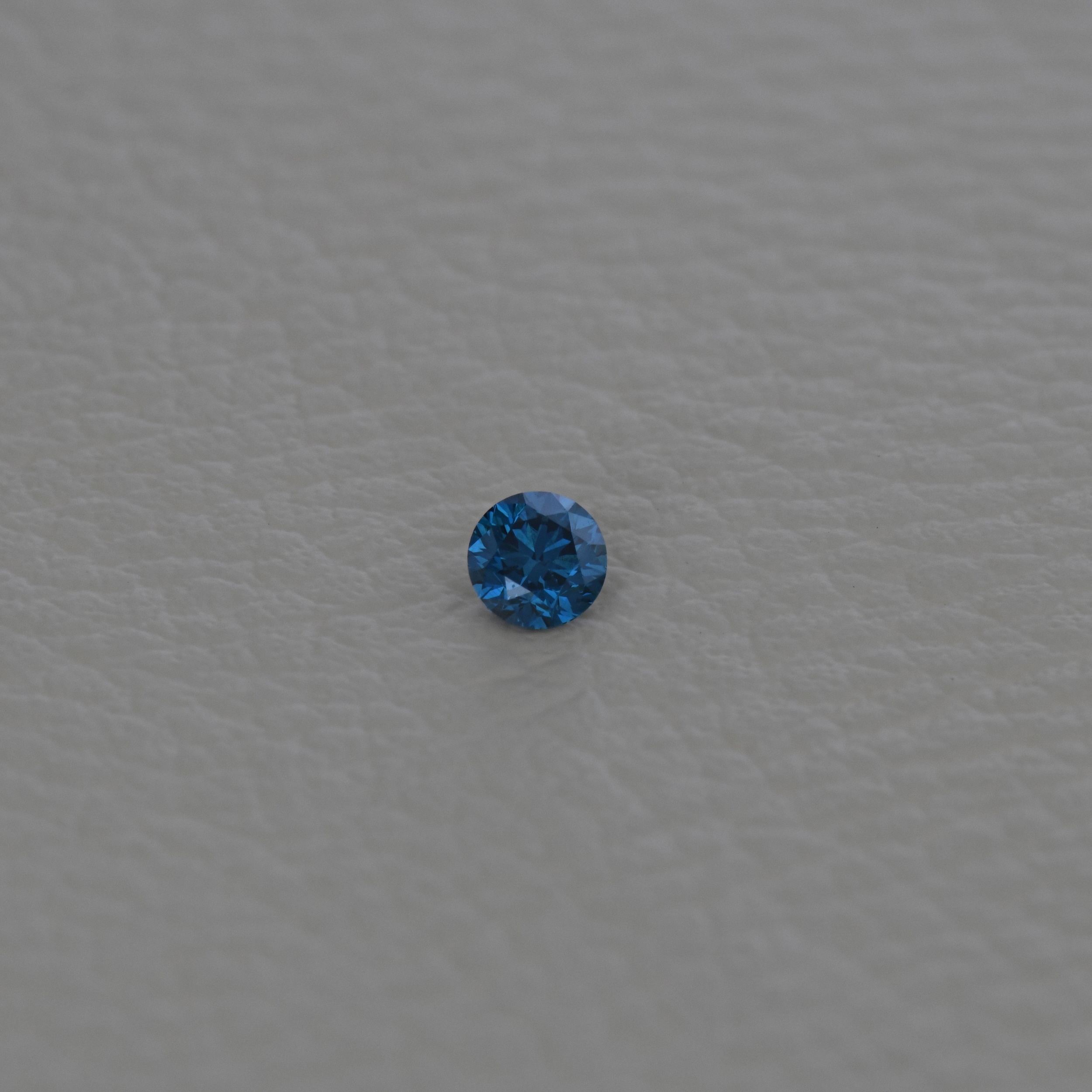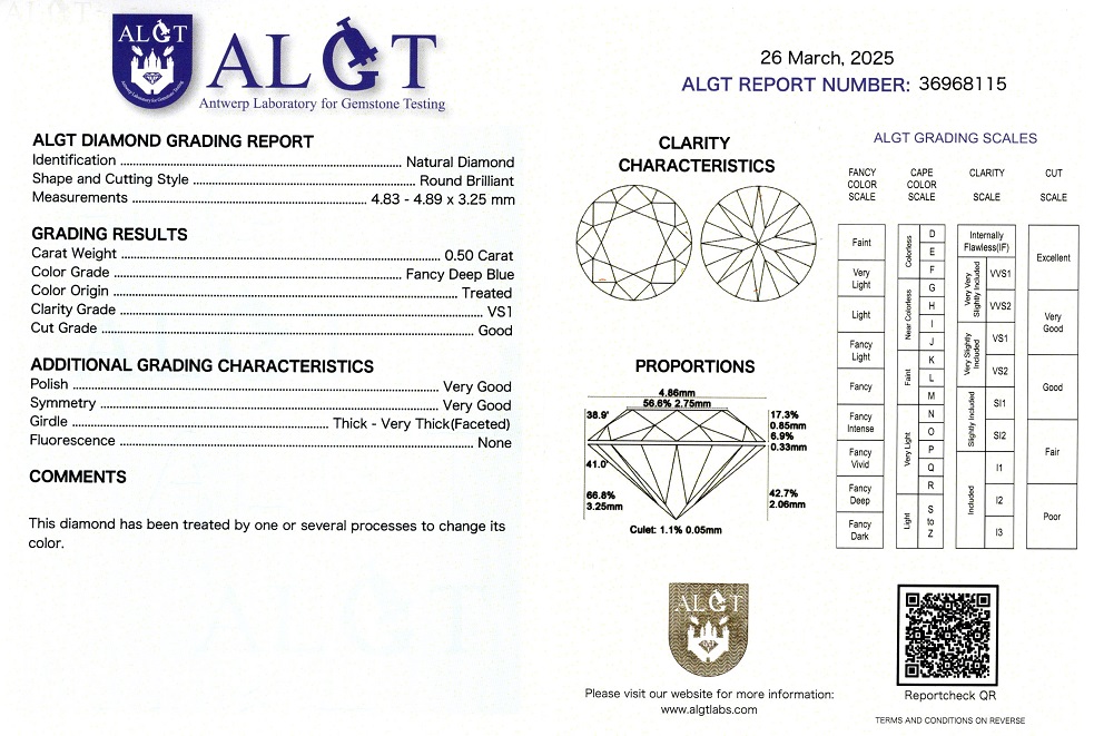 Diamant natural 0,50 carate, culoare Fancy Deep Blue, claritate VS1, forma rotunda briliant, fluorescenta absenta, dimensiune 4,83 – 4,89 x 3,25 mm, certificare ALGT Antwerp nr. 36968115.