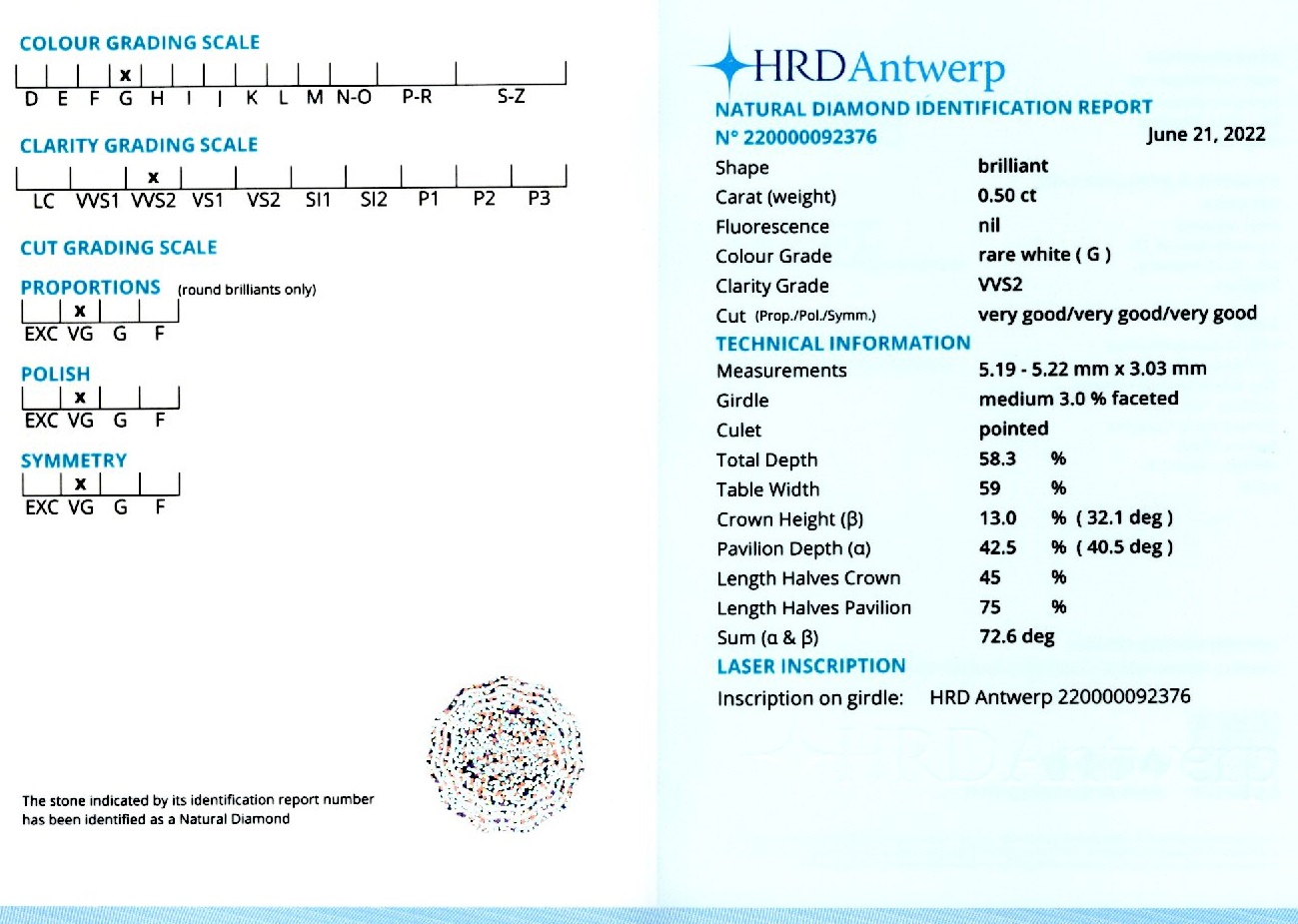 Diamant natural 0,50 ct., culoare G(rare white), claritate VVS2, forma briliant, taietura VG, fluorescenta absenta, dimensiune 5,19 – 5,22 x 3,03 mm, certificare HRD Antwerp 220000092376.
