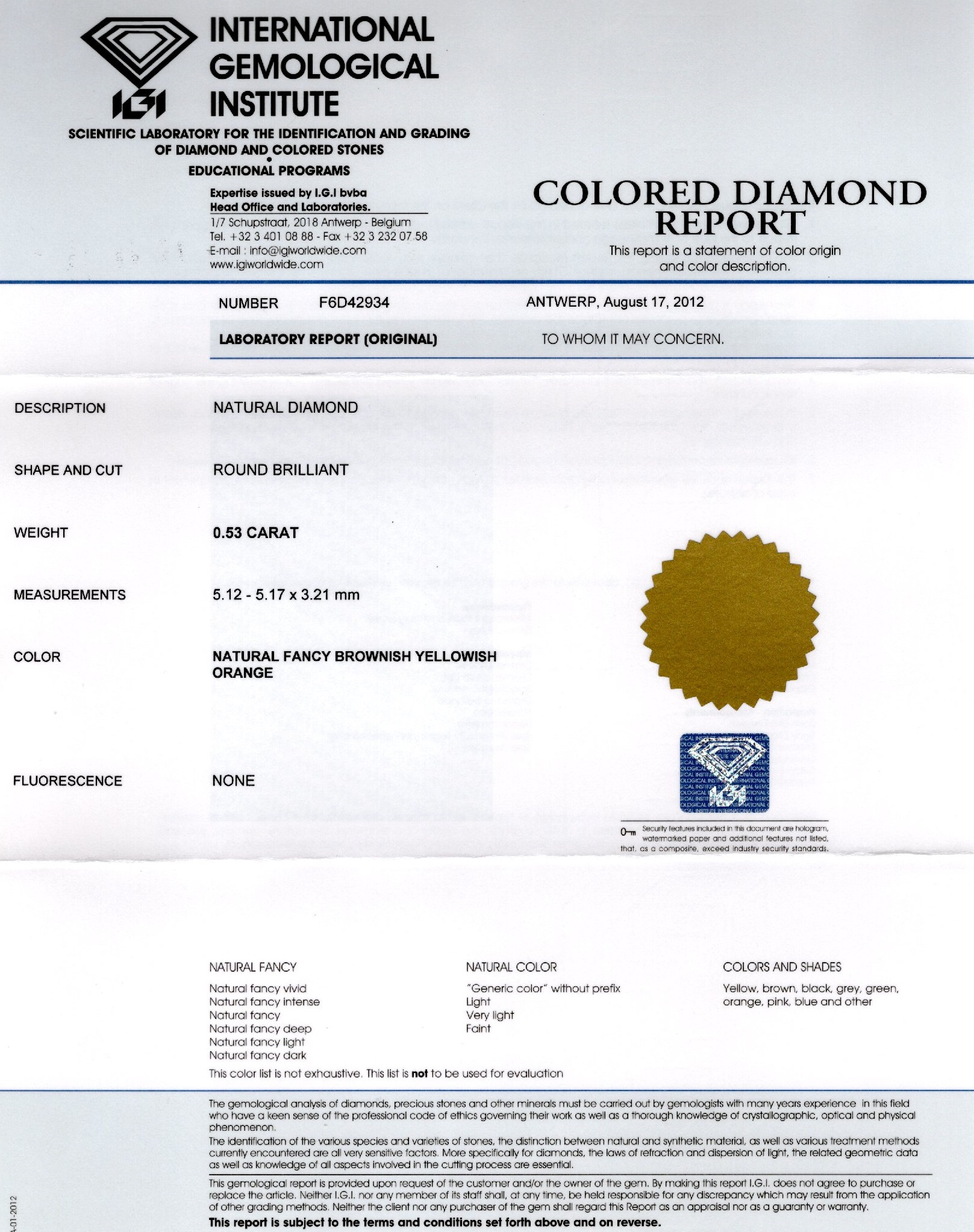 Diamant natural 0,53 ct., culoare natural Fancy brownish yellowish orange, forma rotunda briliant, fluorescenta absenta, dimensiune 5,12 – 5,17 x 3,21 mm, certificare IGI Antwerp Belgia F6D42934. Diamantul este sigilat in carcasa de plastic.