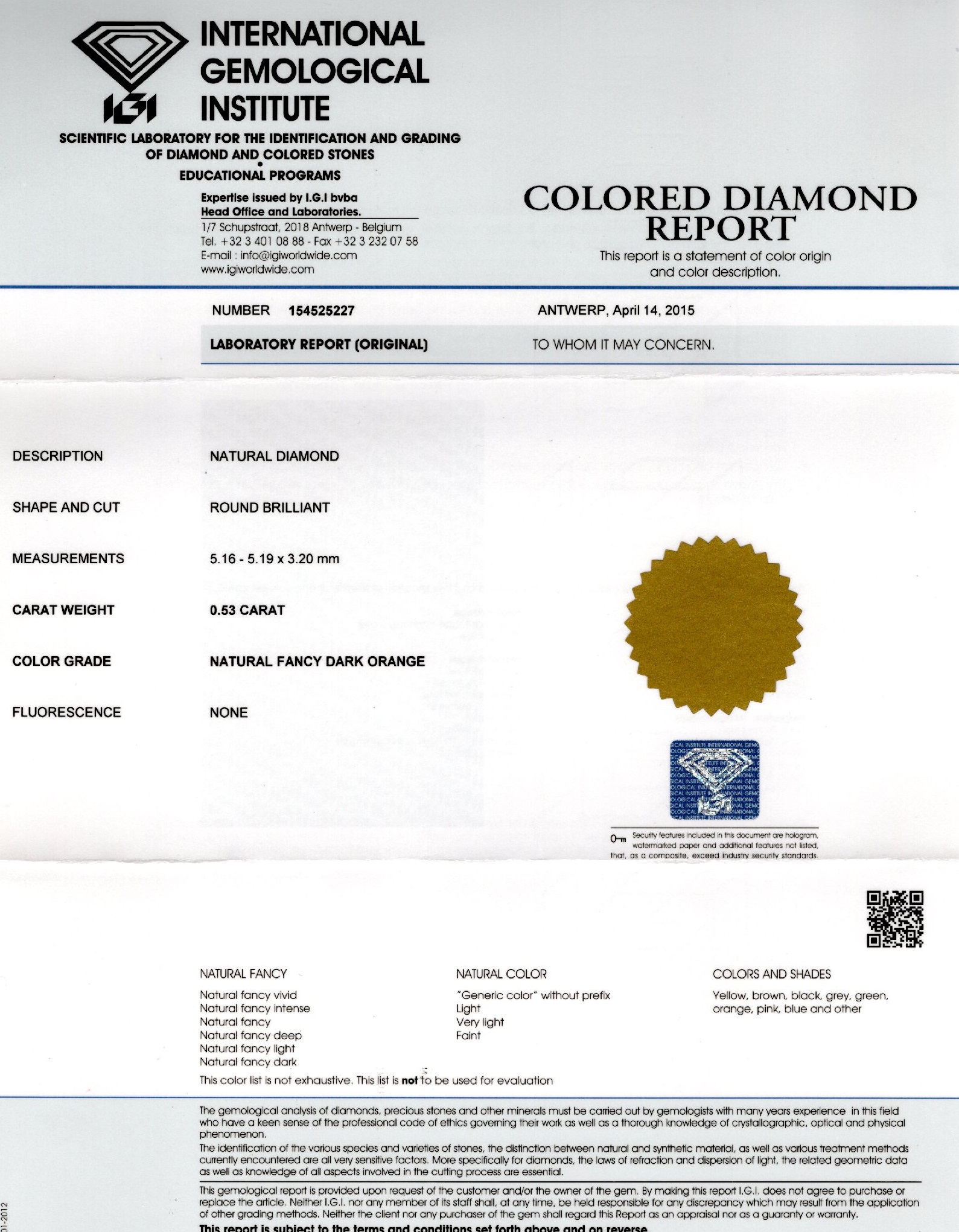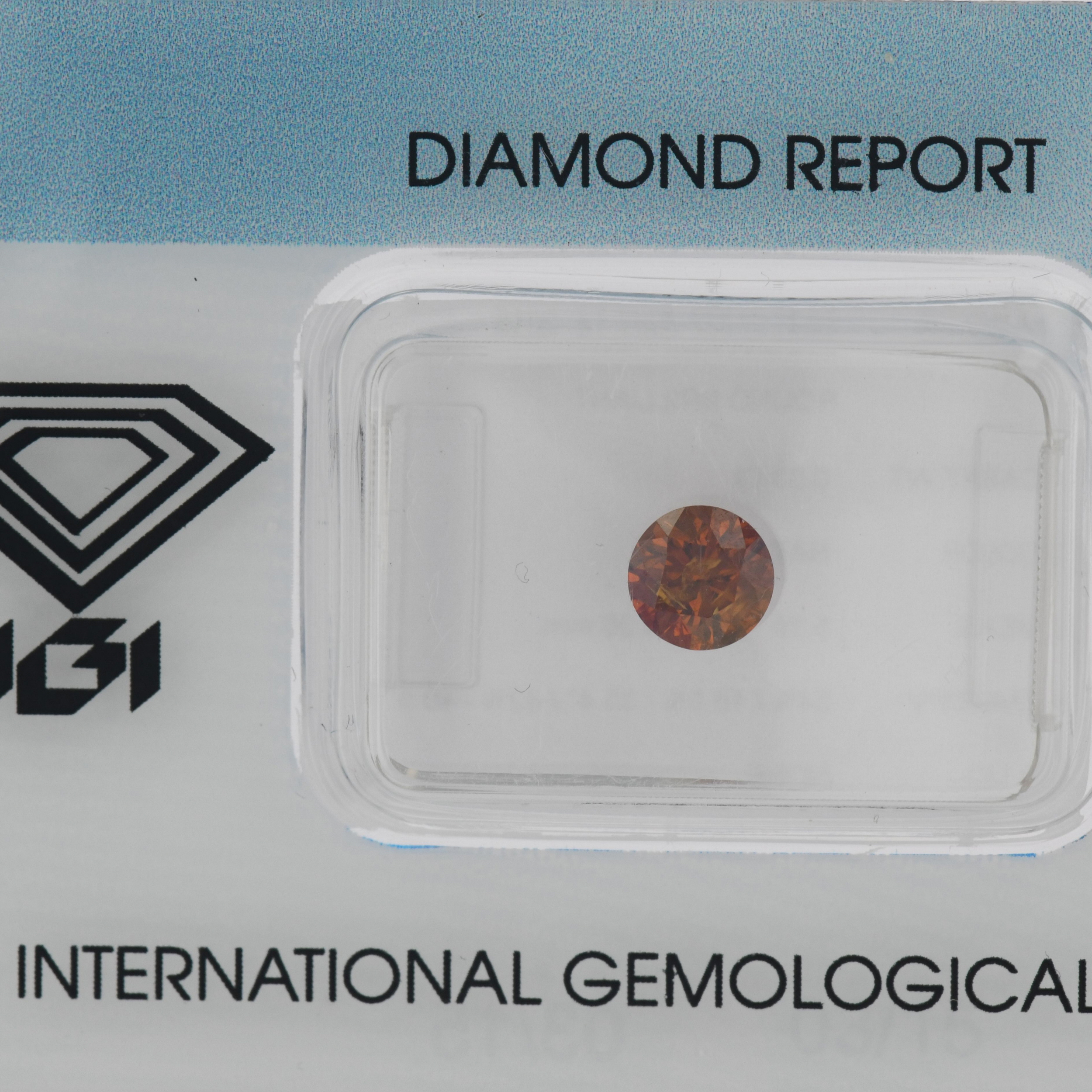 Diamant natural 0,53 ct., culoare natural Fancy dark orange, forma rotunda briliant, fluorescenta absenta, dimensiune 5,16 – 5,19 x 3,20 mm, certificare IGI Antwerp Belgia 154525227. Diamantul este sigilat in carcasa de plastic.
