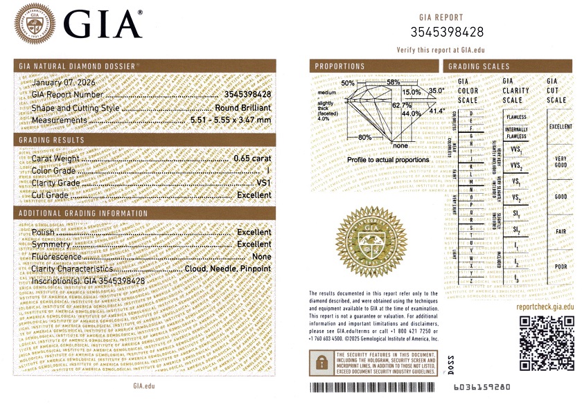 Diamant natural 0,65 ct., culoare I, claritate VS1, forma rotunda briliant, fluorescenta absenta, taietura EXC, dimensiune 5,51 – 5,55 x 3,47 mm, certificare GIA 3545398428.