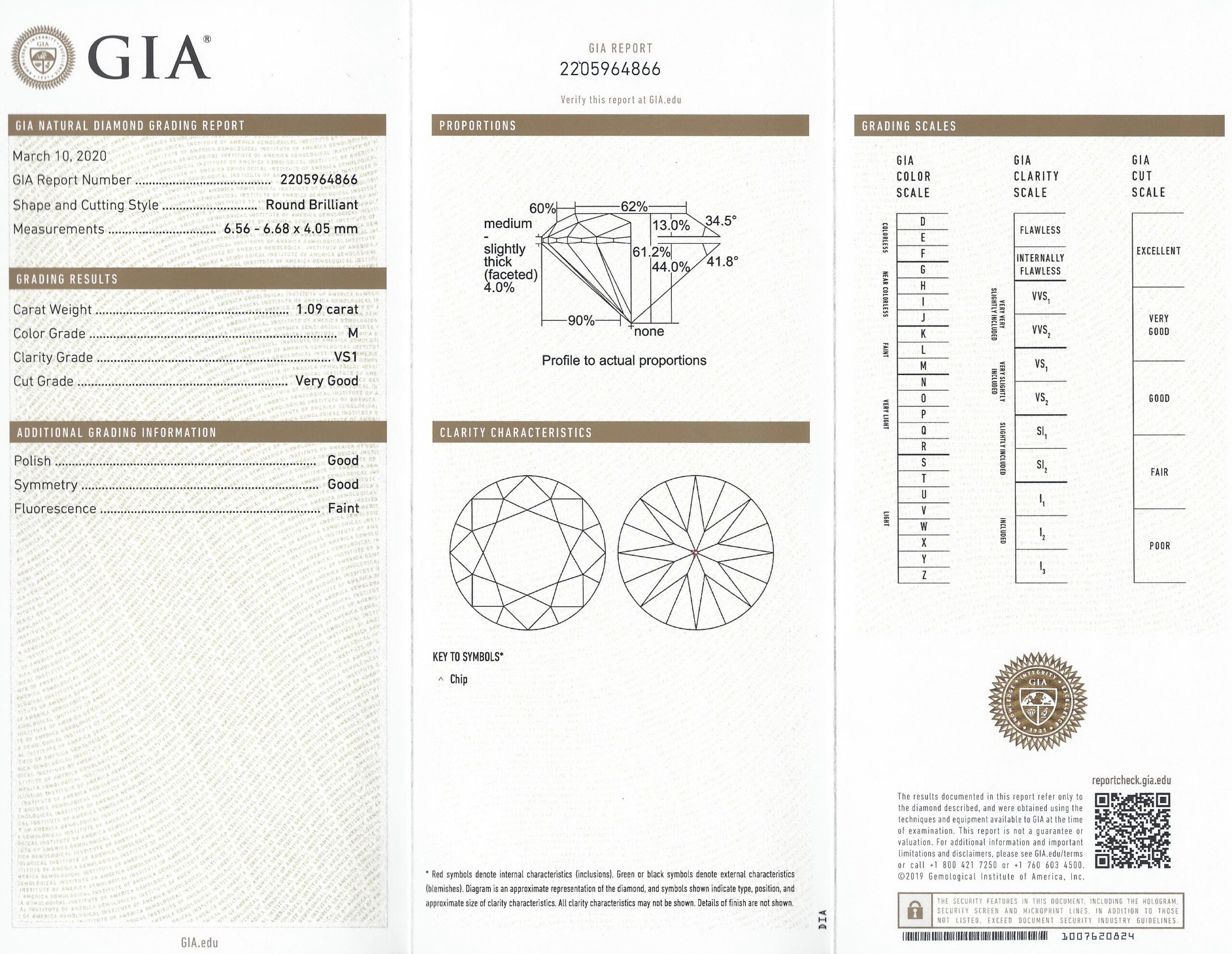 Diamant natural 1,09 carate, culoare M, claritate VS1, forma rotunda briliant, taietura VG, fluorescenta slaba, dimensiune 6,56 – 6,68 x 4,05 mm, certificare GIA nr. 2205964866.