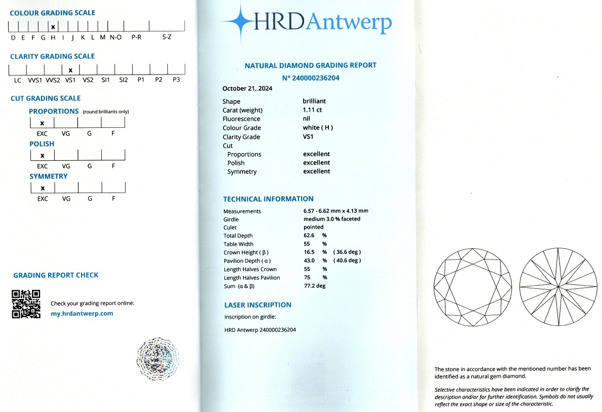 Diamant natural 1,11 carate, culoare H(white), claritate VS1, forma briliant, taietura EXC, fluorescenta absenta, dimensiune 6,57 – 6,62 x 4,13 mm, certificare HRD Antwerp 240000236204.