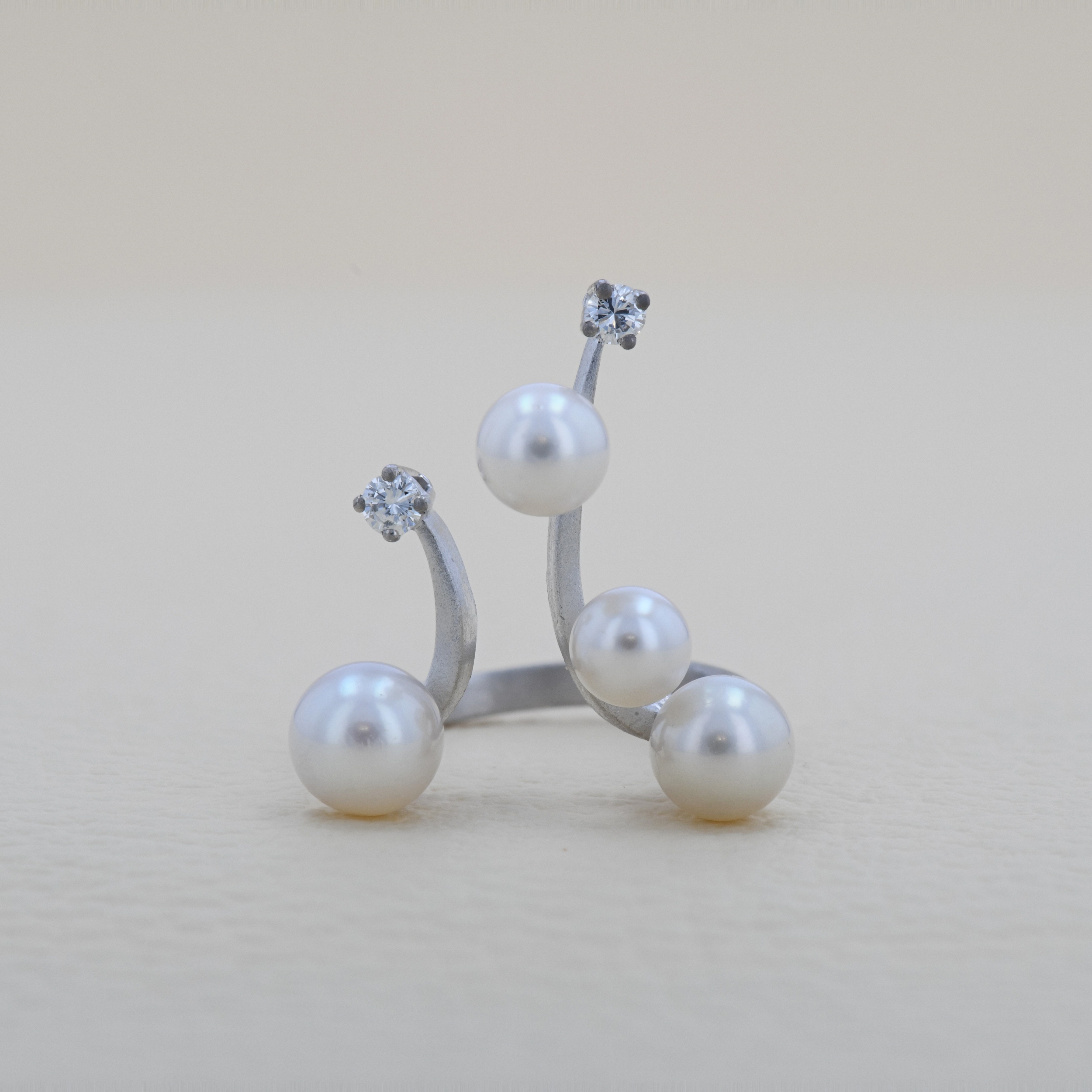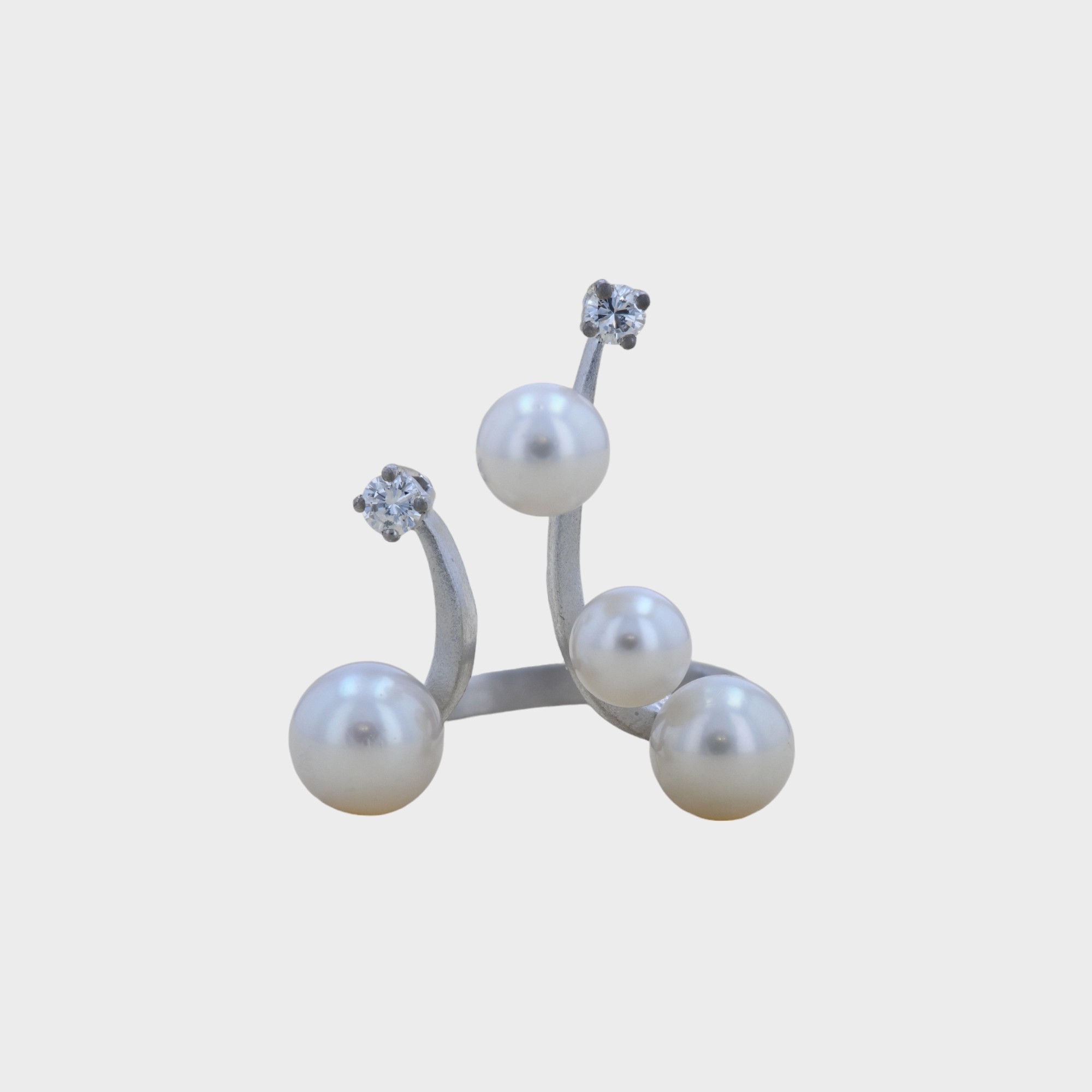 Inel din aur alb 18k, 6,45 grame, perle de cultura cu diametre de ~ 7,4 mm; 6,9 mm; 5,8 mm; 6,3 mm; diamante ~ 0,18 ct.(2 bucati), claritate VS, taietura briliant, masura 53 – 58, latime sina ~ 0,24 cm.