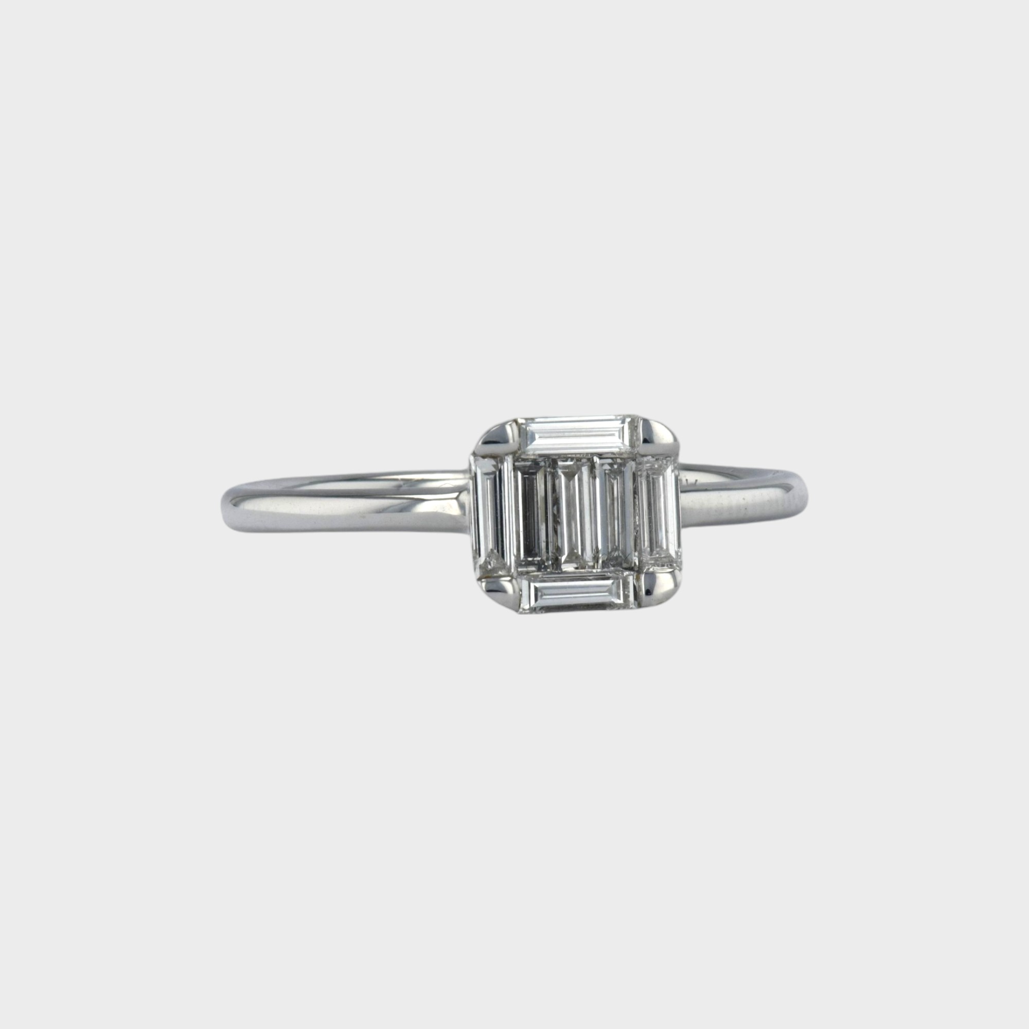 Inel din aur alb 18k, 2,62 grame, diamante ~ 0,42 ct.(7 bucati), claritate VS – SI, taietura bagheta, masura 54, latime sina ~ 0,2 cm, dimensiunea monturii la exterior ~ 0,6 x 0,7 cm.