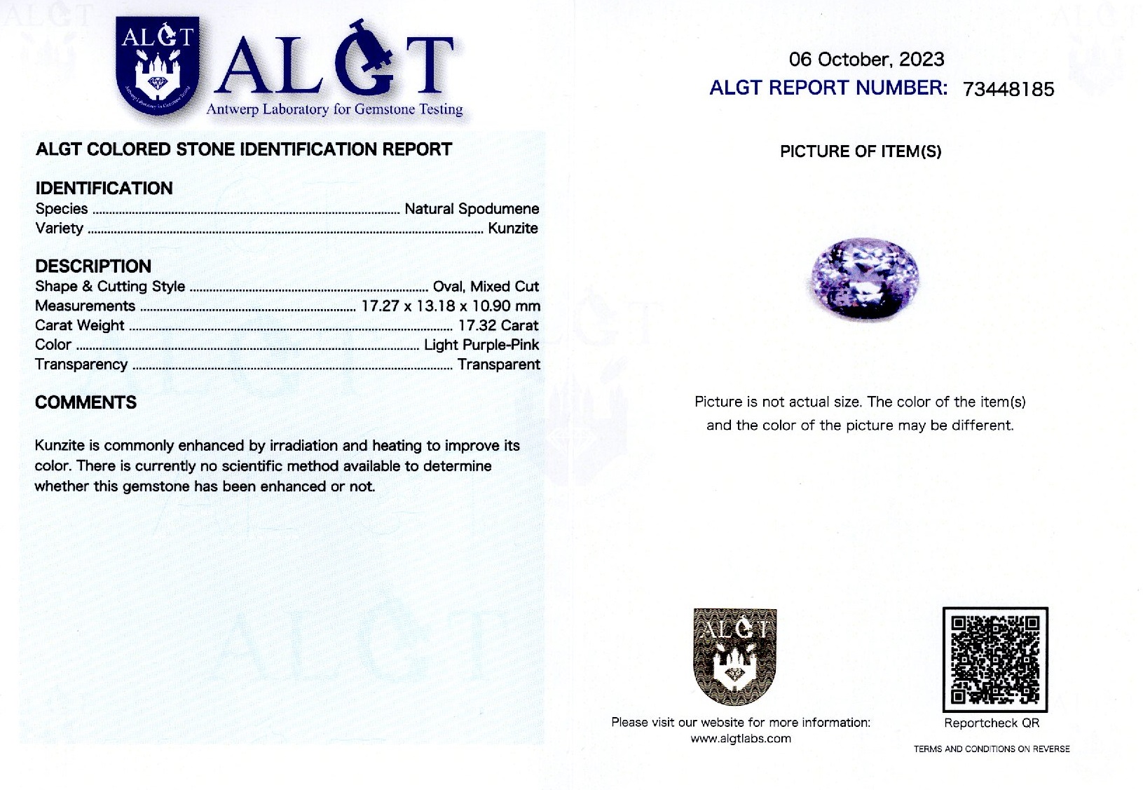 Kunzit 17,32 ct., culoare roz-violet deschis, forma ovala, taietura mixta, transparent, specie spodumen natural, certificare ALGT Antwerp nr. 73448185, dimensiune 17,27 x 13,18 x 10,90 mm.