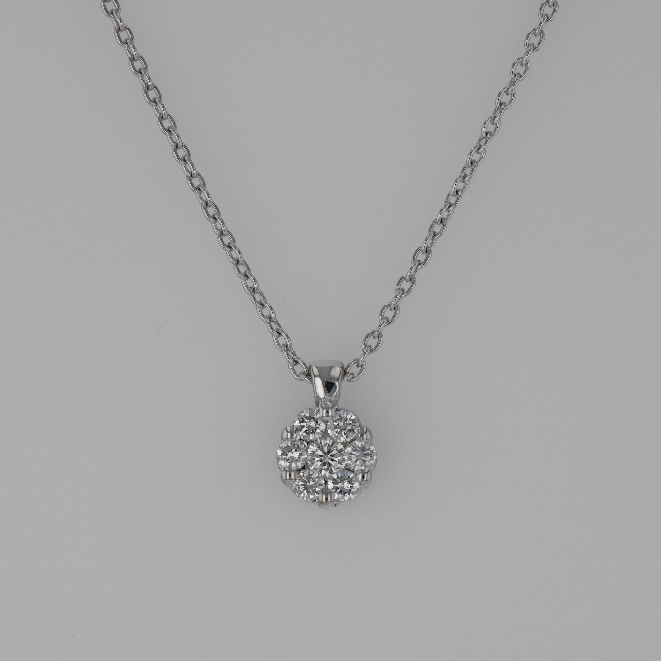 Lant cu pandantiv 2,63 grame aur alb 18k, diamante ~ 0,22 ct.(7 bucati), taietura briliant, culoare G, claritate VS, lungime lant ~ 42 cm, dimensiune pandantiv ~ 0,8 x 0,6 cm.