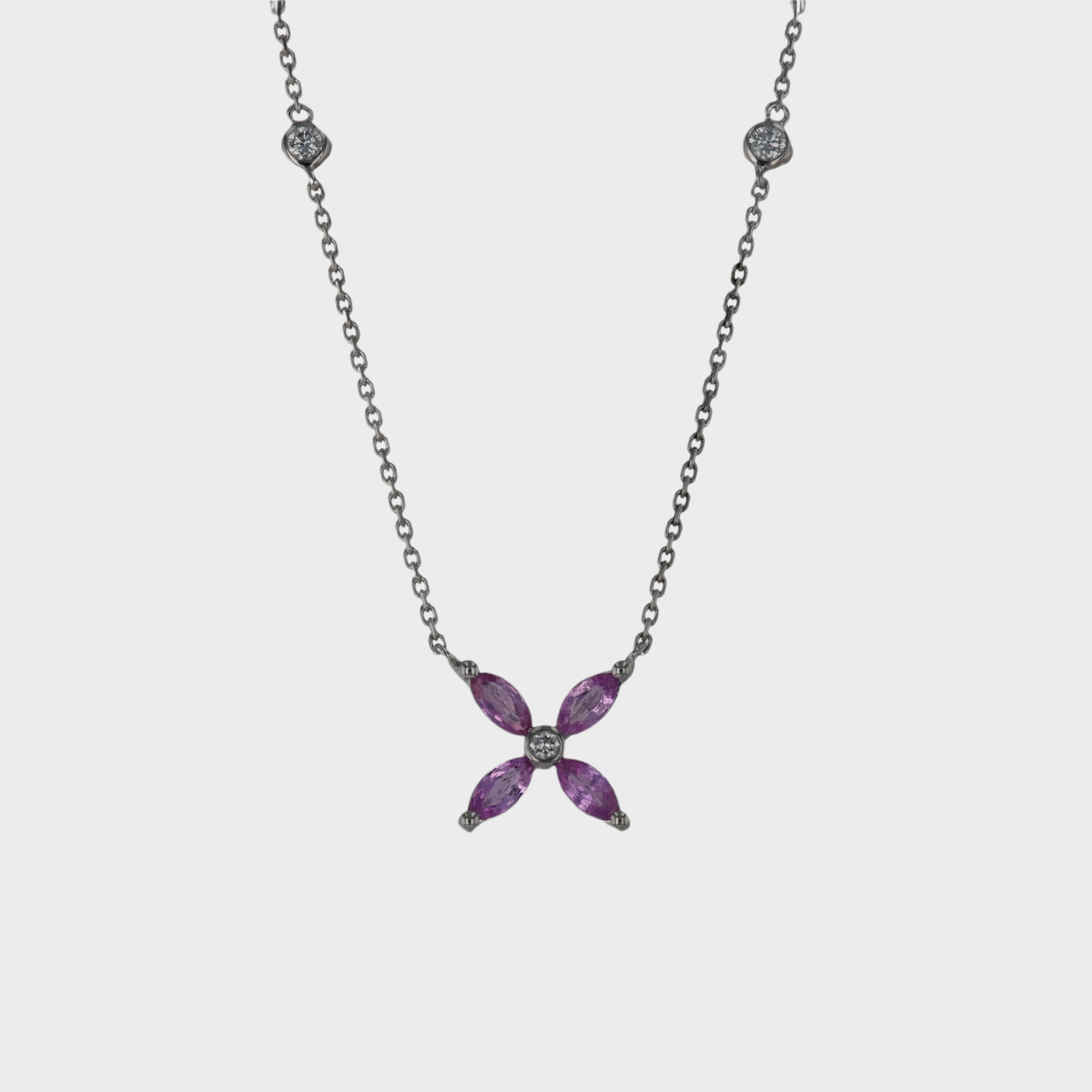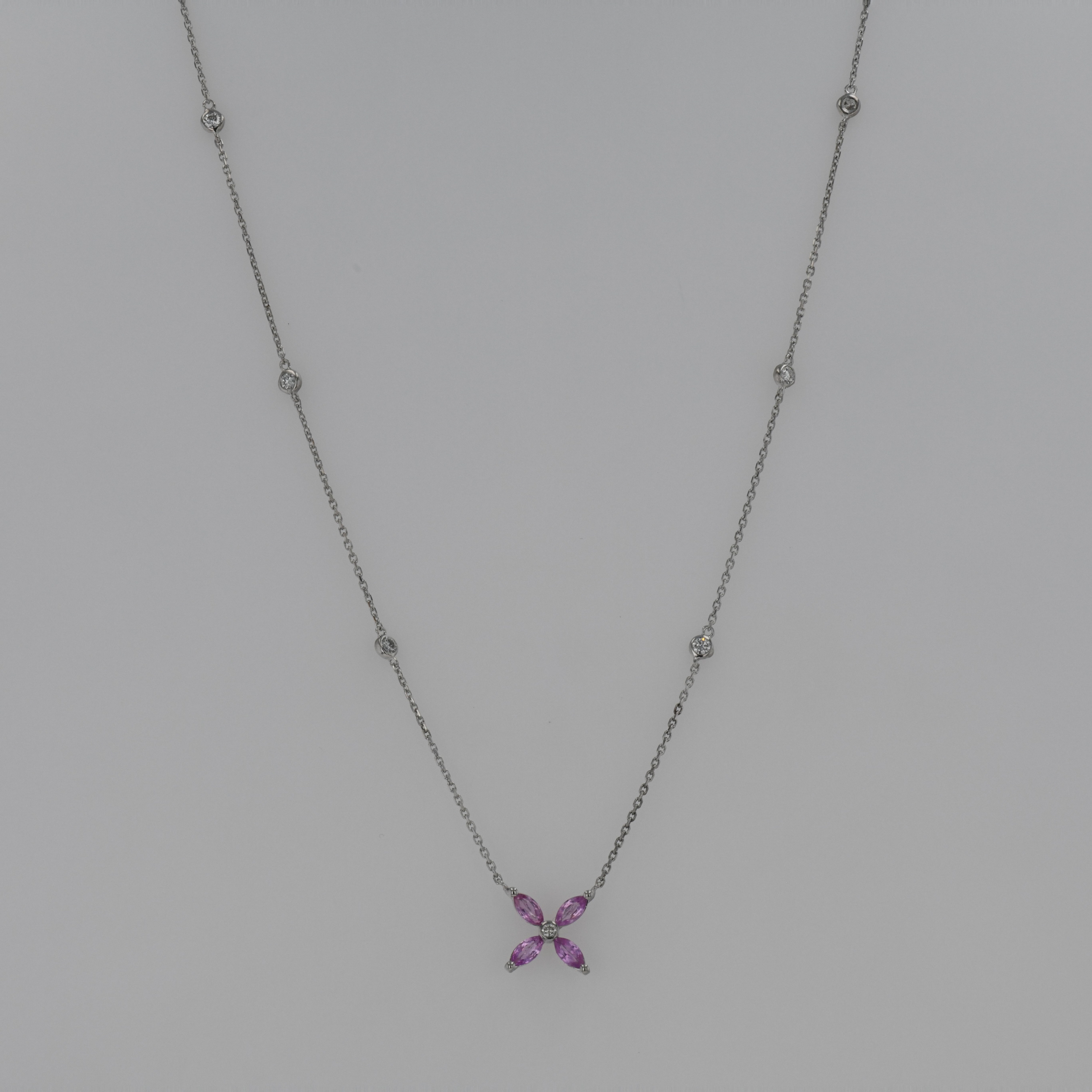 Lant cu pandantiv 3,19 grame aur alb 18k, safire roz ~ 0,72 ct.(4 bucati), taietura marquise, diamante ~ 0,27 ct.(7 bucati), taietura rotunda briliant, culoare F – G, claritate VS, lungime lant ~ 42 cm, dimensiune pandantiv ~ 0,5 x 0,5 cm.