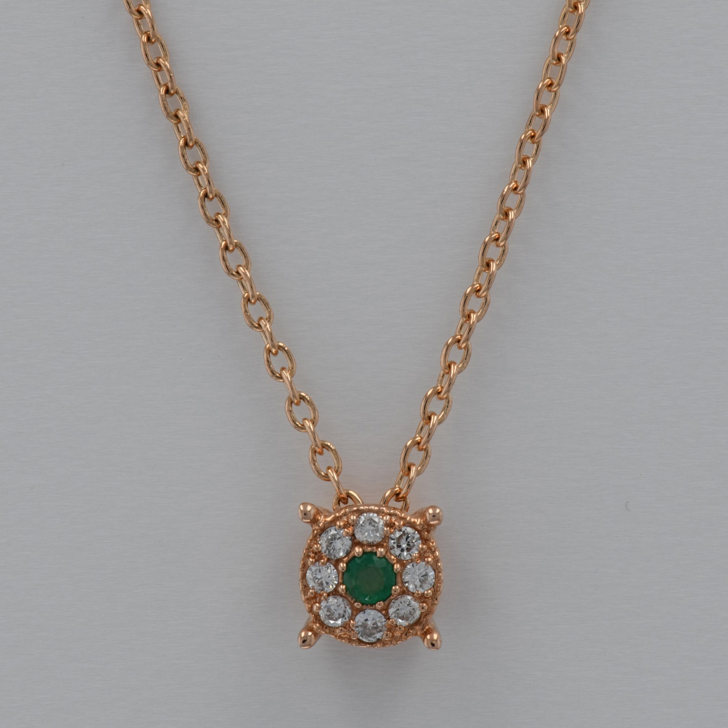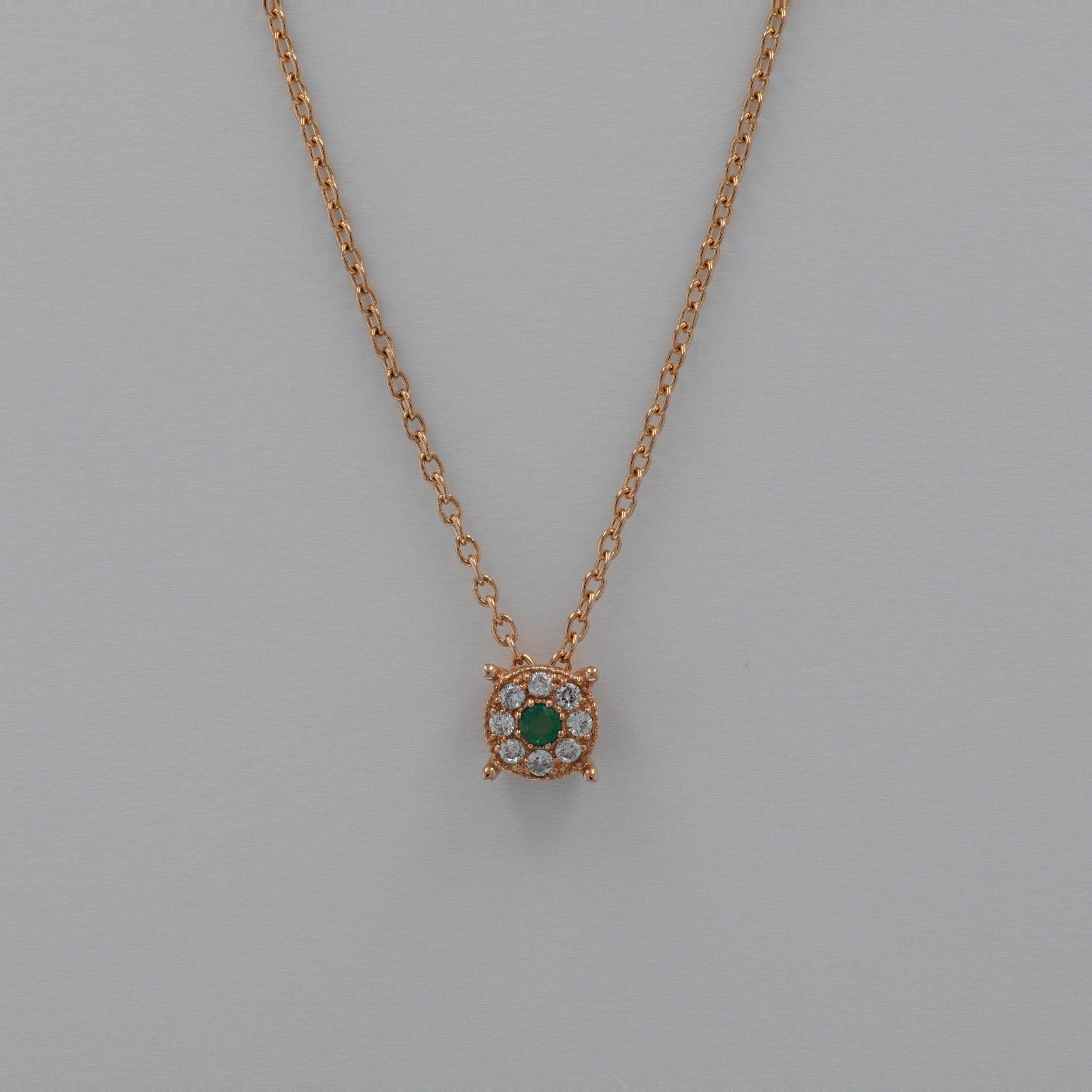 Lant cu pandantiv din aur roz 18k, 2,29 grame, smarald ~ 0,03 ct., taietura briliant, diamante ~ 0,06 ct.(8 bucati), taietura briliant, lungime lant ~ 43 cm, dimensiune pandantiv ~ 0,53 x 0,53 cm.