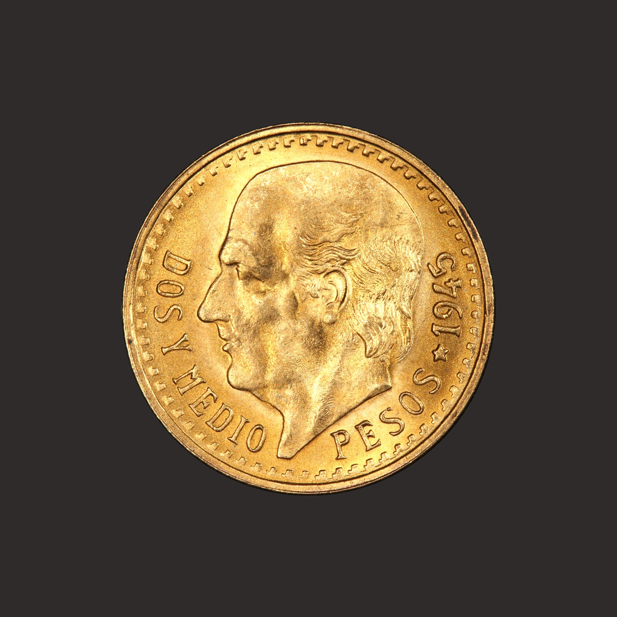Moneda aur 2 ½ pesos Mexic(1945), aur cu puritate 900(21,6 carate), aproximativ 2,08 grame. TVA 0%.