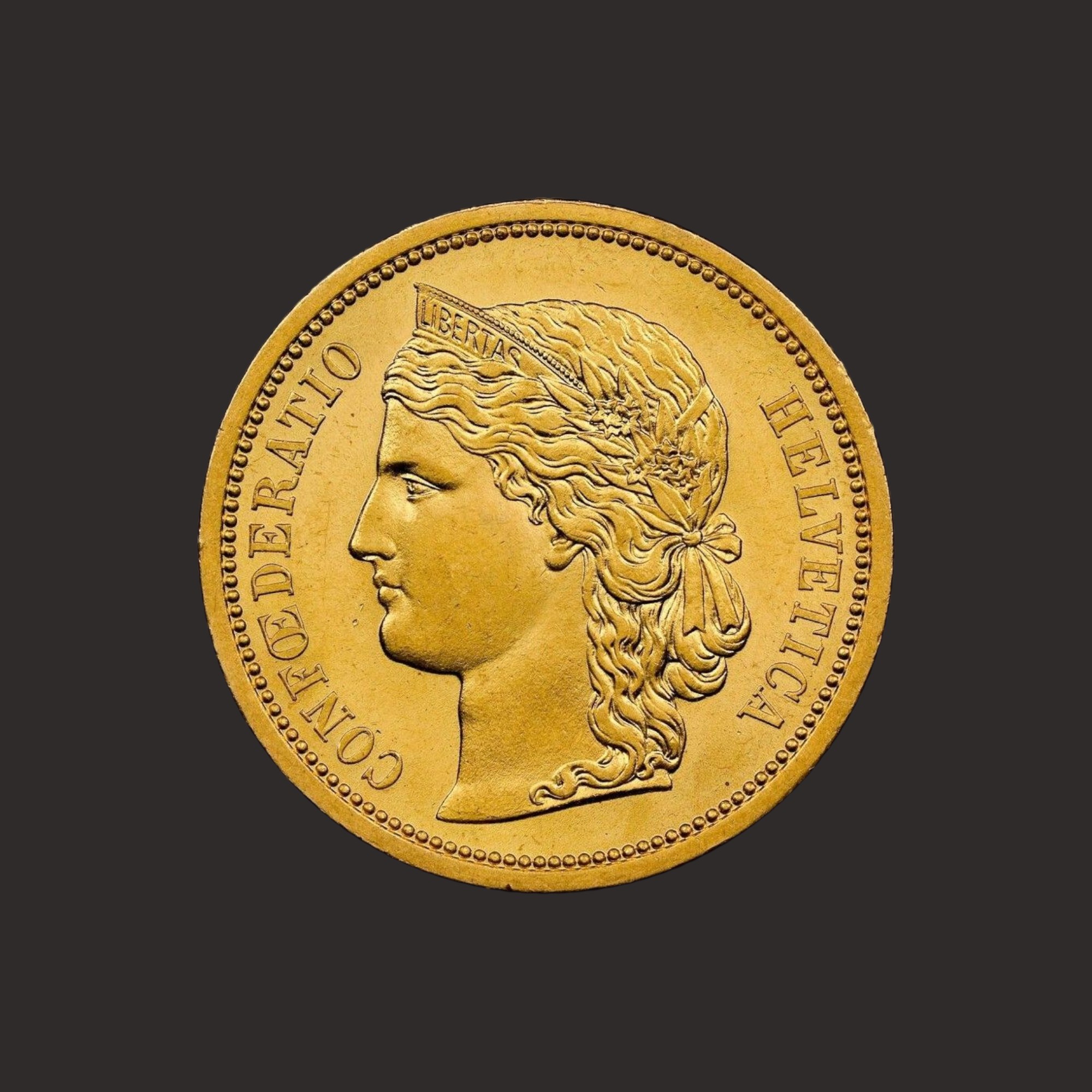 Pe aversul monedei de aur este prezentata efigia lui Libertas – personificarea feminină a Libertatii, din profil, cu fata indreptata catre stanga, avand parul legat in panglica, cu o coronita din flori de colt si o tiara cu textul „LIBERTAS” (Libertate, în latină). De o parte si de alta a monedei este textul „CONFŒDERATIO HELVETICA”(Confederatia Elvetiana). Gravorul monedei este Karl Schwenzer iar designerul aversului monedei de aur este Albert Walch.